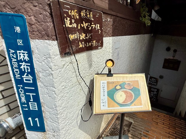東京タワーも麻布台ヒルズもすぐそこという大都会にありながら、この一角だけ昭和な雰囲気が漂っている。「只今おいしい珈琲を焙てております」「絶品ハヤシライスと珈琲とセットでお召し上がり下さい!」とのこと。