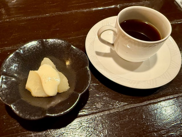 雑味がなくスッキリとしたコーヒーもあっさり味の洋梨のコンポートも、ハヤシライスの後の口直しになる。昭和の喫茶店らしいクラシカルなカップも素敵だ。
