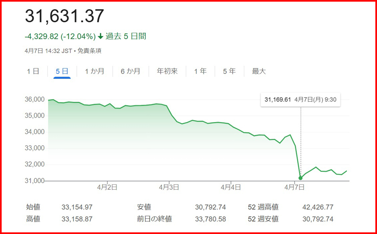 だが、日経平均株価は全くもってほのぼのしていない。むしろ激震。2025年4月7日は市場開始30分で2667円下落して3万1169円をつけた。4月2日まで3万5000円台だったことを考えると、桜散るどころか木が折れそうな勢いである。
