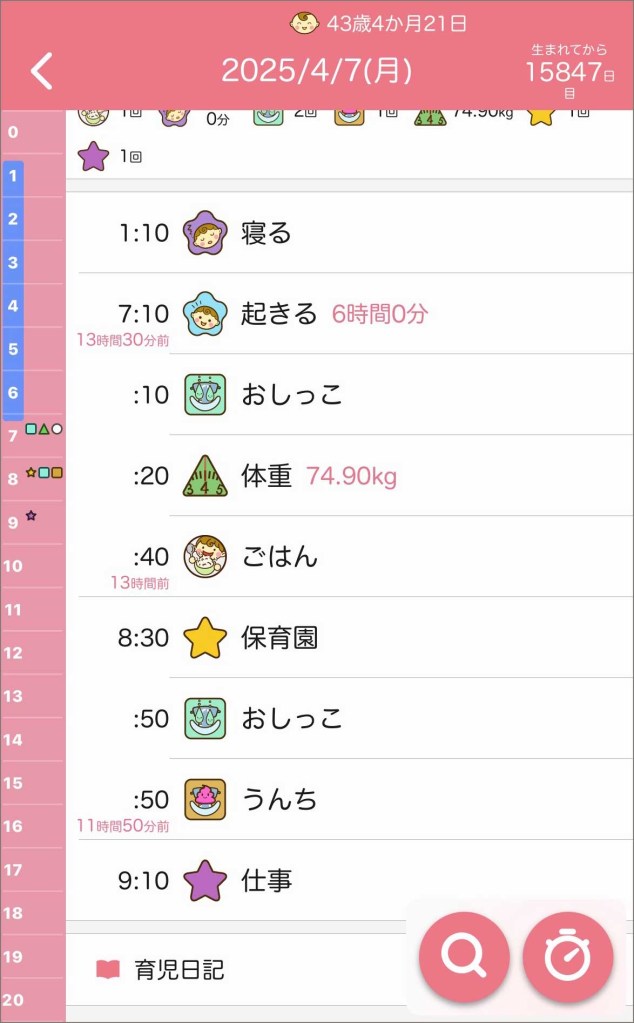 大人が自分の時間管理に育児記録アプリを使うメリット、それは24時間の使い方をユル〜く可視化できるってことかと思う。