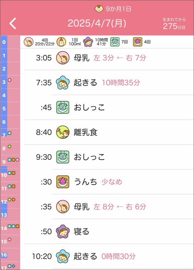 我が家では『ぴよログ』というアプリを導入しているのだが、ひと目で「ミルクを◯時にあげてるからそろそろ授乳かな」とか、「◯時に起きてるからあと少しで眠くなるな」ってことがわかって便利。