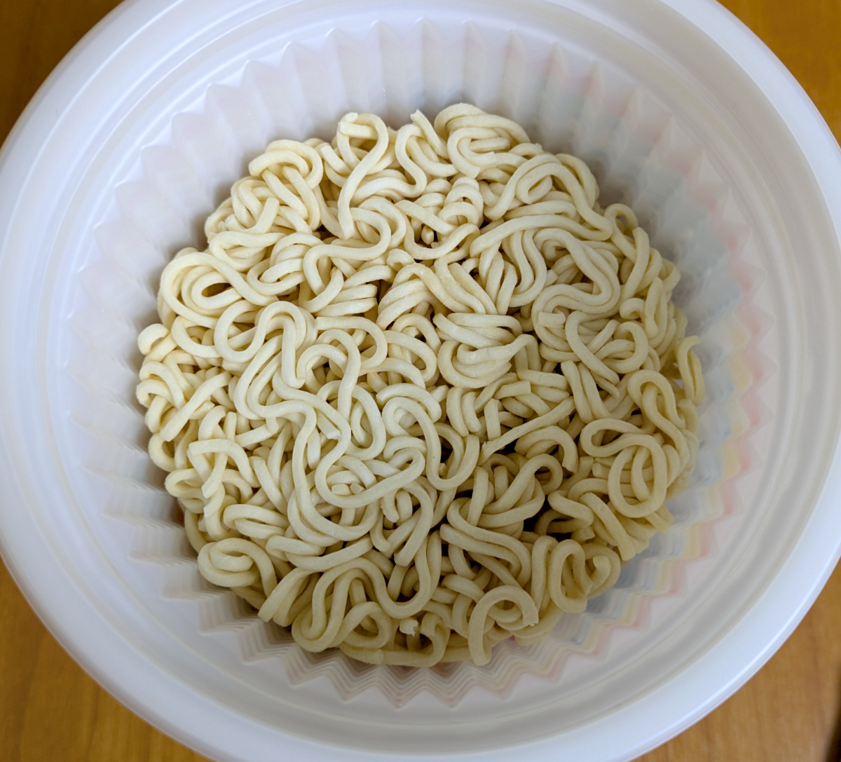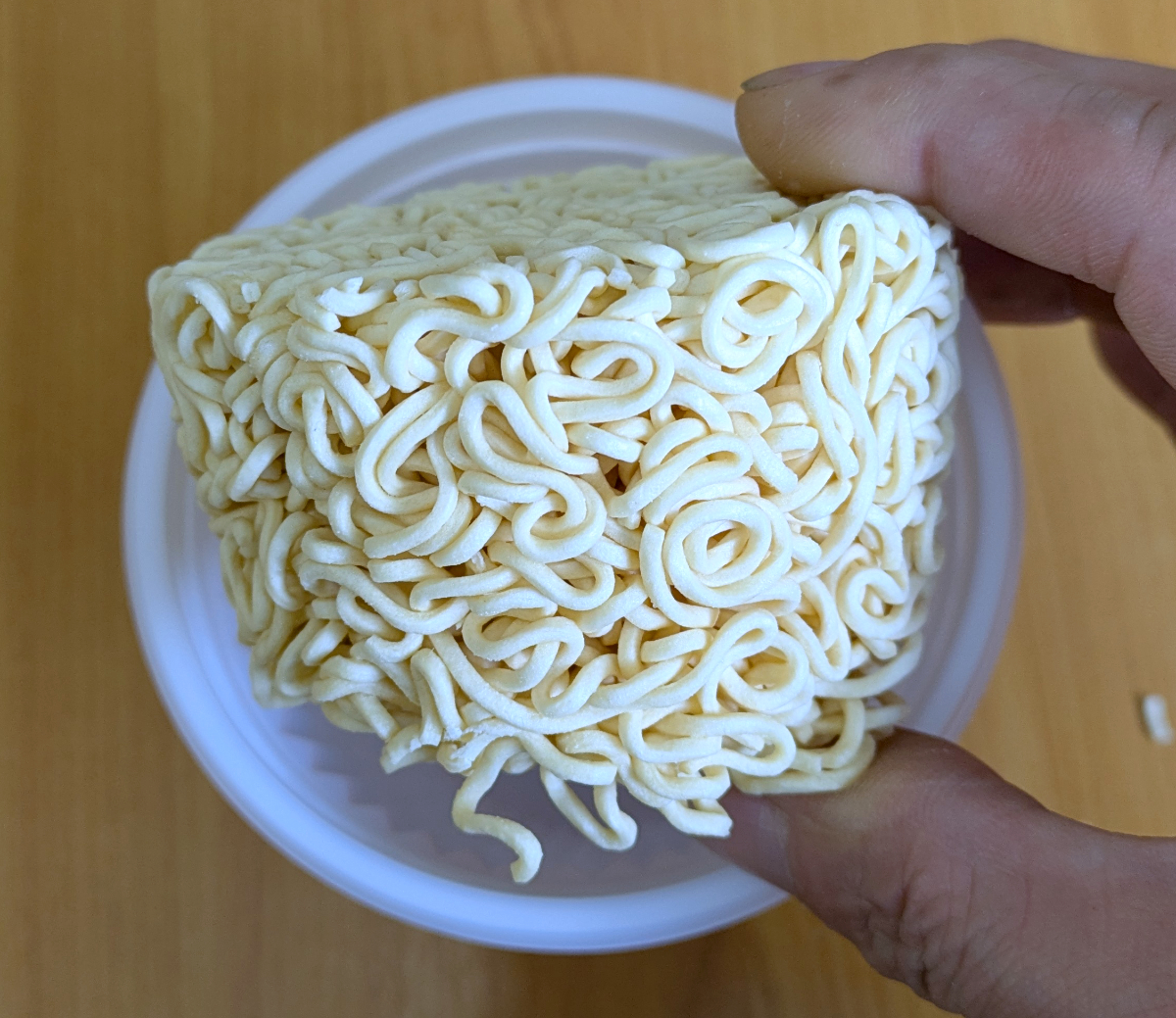 麺はカップにピッタリ入っていて、容器と麺との間に遊びはない。ジャストサイズで収まっているそのさまから、製造技術の高さがうかがえる。