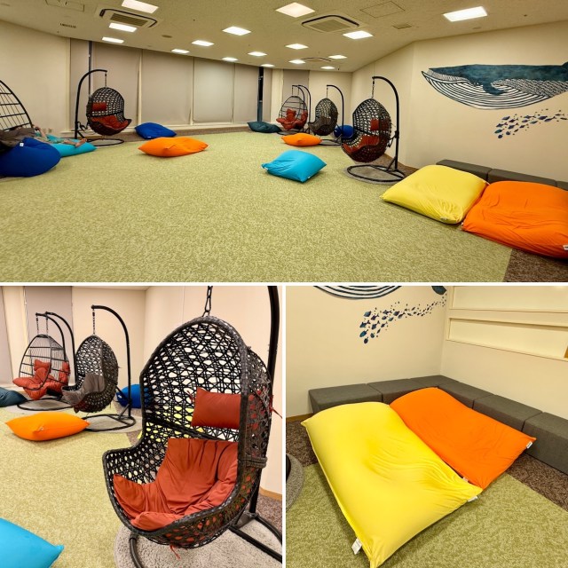 くつろぎルーム「なごみ」をのぞいてみると……ハンモックとクッションが並んでいた。休憩には良さそうだが、ここで寝るのはちょっと違うかも。とにかくベストではなさそうだ。