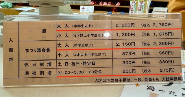 まつり湯の営業時間は「月〜土10時30分〜翌日9時」「日曜日10時30分〜23時」で年中無休とのこと。公式サイトの案内によると駐車場もあるらしく、まつり湯を利用する方は2時間無料・5000円以上の利用で4時間無料になるサービスもある。