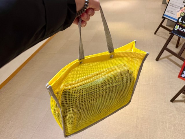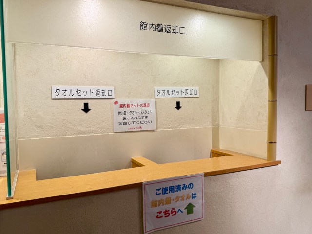 フロントに下駄箱の鍵を預けて、ロッカーキーを受け取る。館内での飲食や自販機などの支払いはロッカーキーで行うおなじみの仕組みだ。館内着とタオルはメッシュバッグに入っていて、歯ブラシや髭剃り等は浴室にあるもよう。