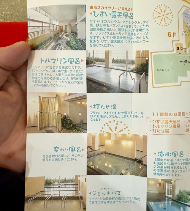 利用者は観光客というより地元の方だろうか。シニア世代がメインでかなり落ち着いた雰囲気。炭酸風呂がないのが残念だったが、スカイツリーがチラ見できる「ひすい風呂」でのんびり疲れを癒して「海水風呂」で浮遊感を楽しんだぞ。
