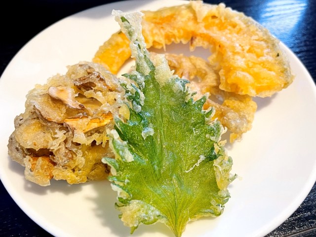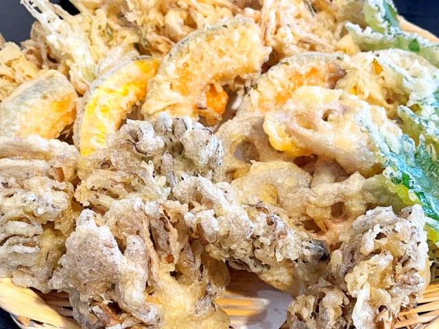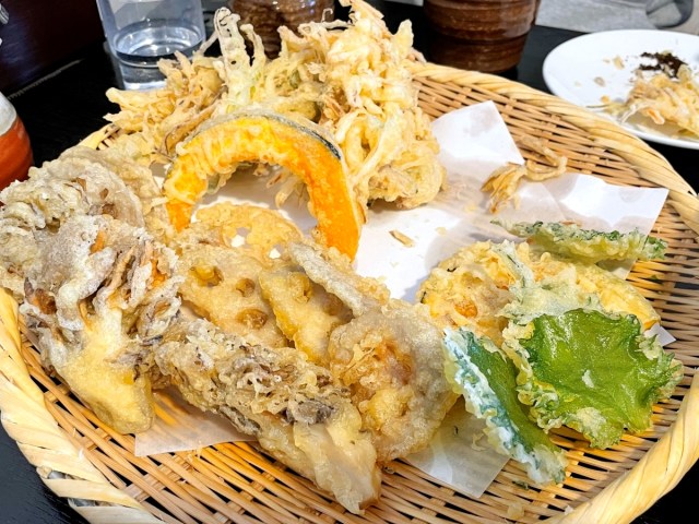 天ぷらは地元の野菜を使用しているとのことで、季節によって食材は変わるらしい。この日はネギと玉ねぎのかき揚げ、かぼちゃ、舞茸、れんこん、大葉の5種類だった。