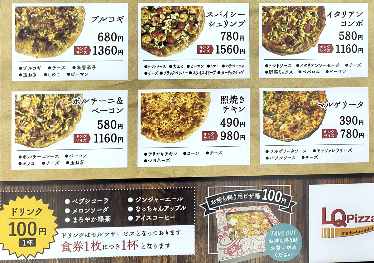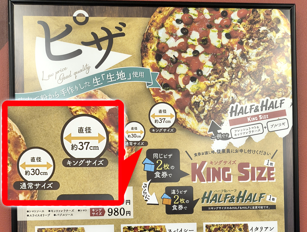 メニューにはピザのサイズが記されている。通常サイズが直径約30センチで、キングサイズは約37センチとのこと。ドミノのLサイズが約32センチなので、通常サイズがドミノのLと考えて良いだろう。