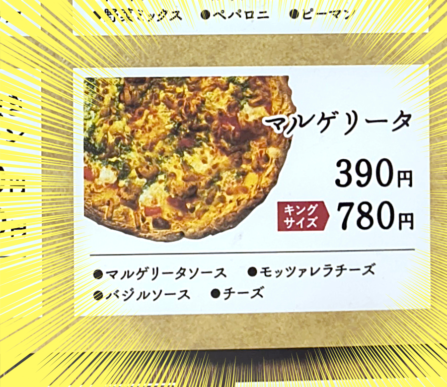 1番安いマルゲリータは、イートインなら390円ッ! 持ち帰りでも箱代100円プラスで490円である。安い! ホールピザが500円以下で食べられるなんて、今どき夢のようだよ。