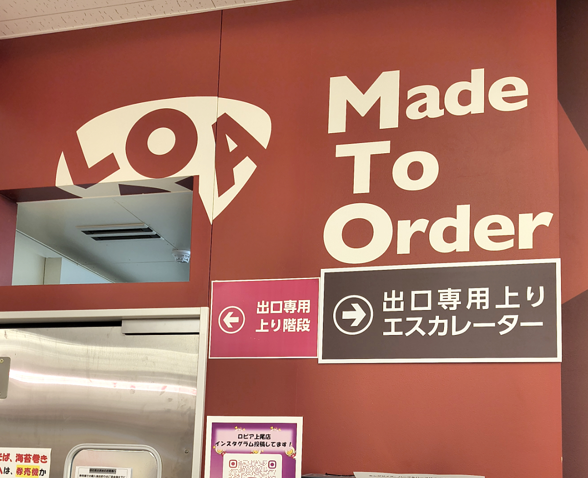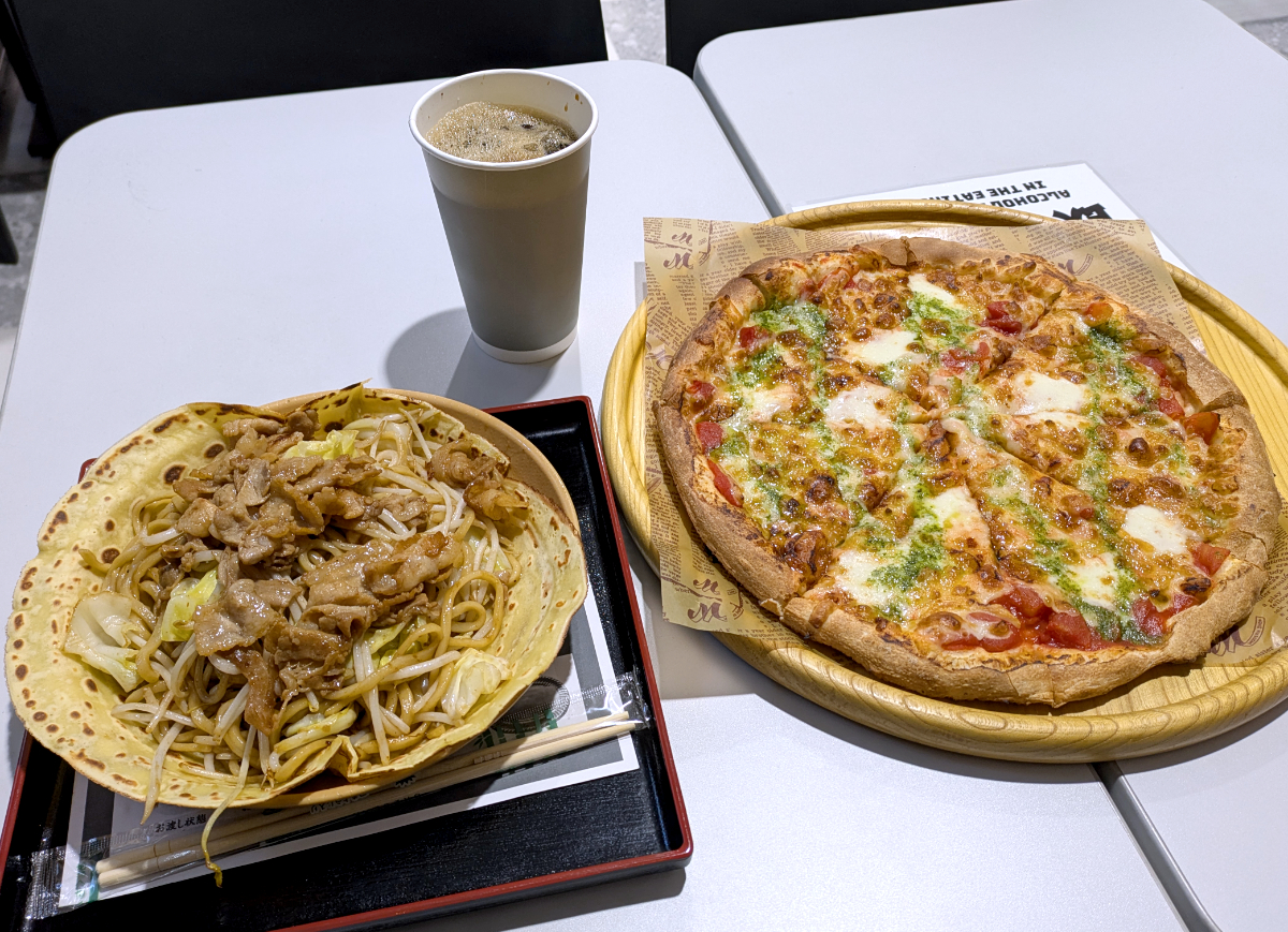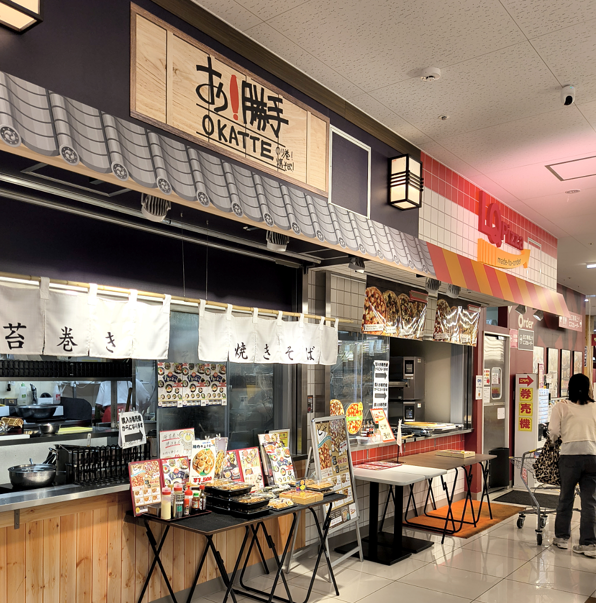エスカレーターを降りたらすぐのところに、目的のお店があった。焼きそば・のり巻きの「お! 勝手」。そして焼きたてピザの「LQ PIZZA」である。いずれもロピアの運営する飲食店で、LQ PIZZAは蘇我のロピアにも出店しているそうだ。