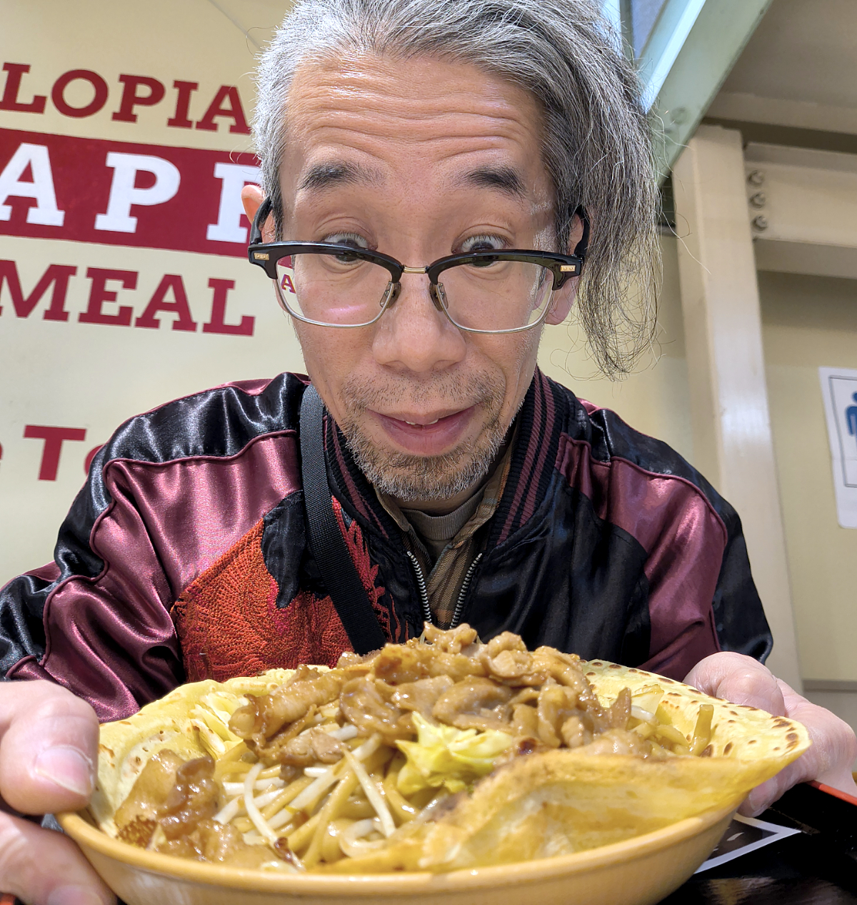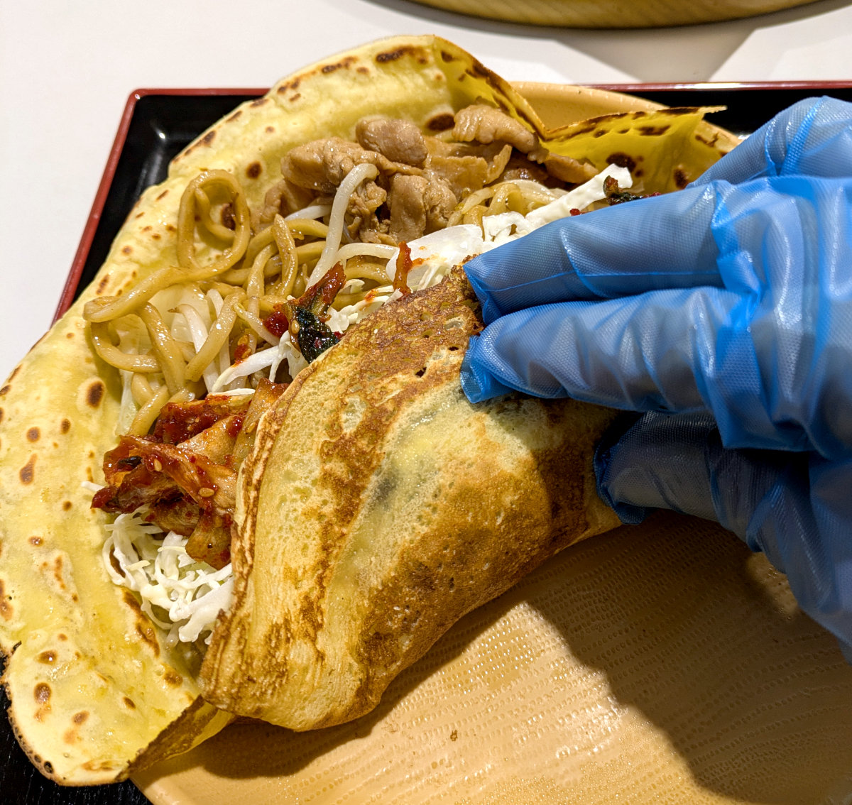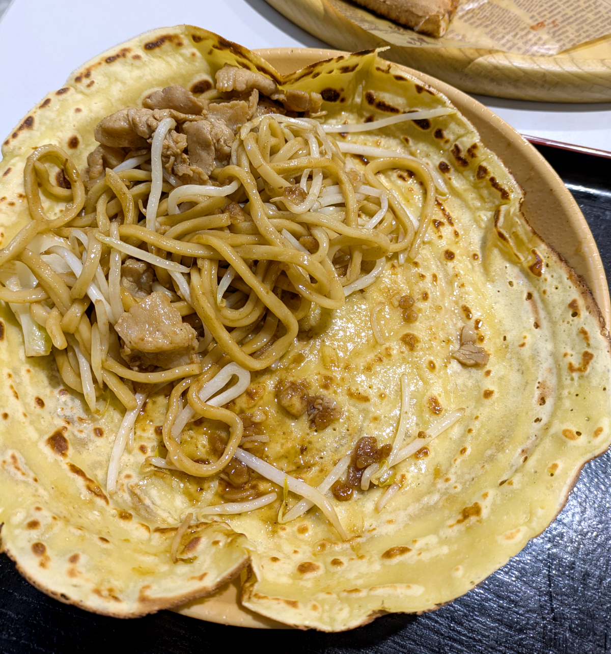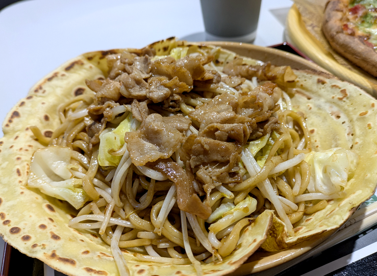 クレープみたいな生地に入った肉焼きそばはてんこ盛り! ピザだけでも怪しいのに、この焼きそばも食い切らねば。やっちまった……。