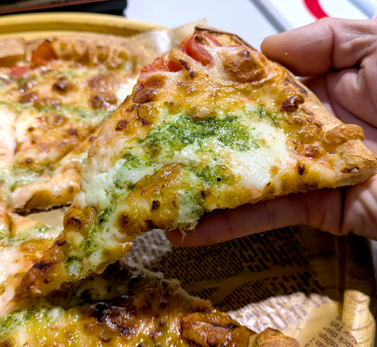 生地は薄目のもっちりタイプ。その上にマルゲリータソース・バジルソース・モッツァレラチーズが乗っており、さらにその上からとろけるチーズがそれらにフタをするように覆いかぶさっている。考えたくはないが、かなりのカロリー爆弾なはず。