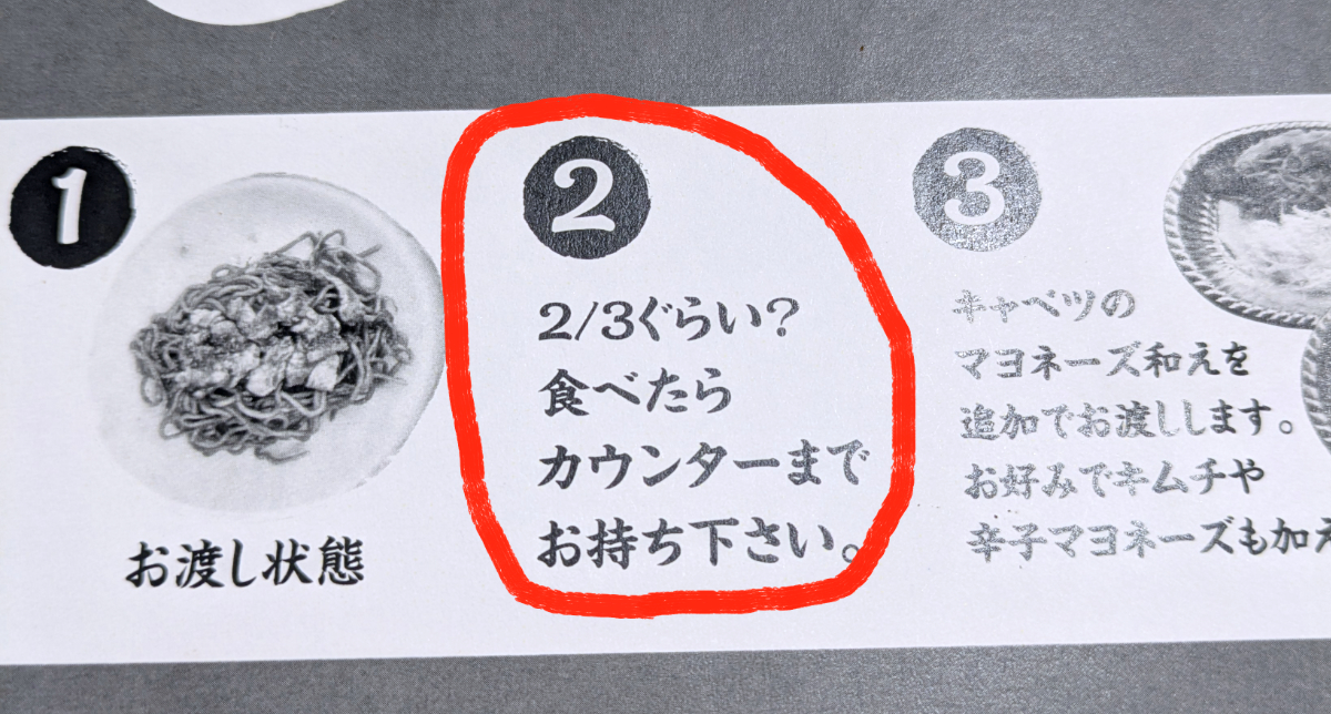 このくらいで良いかな? 約半分食べたところでカウンターへ。お店の人に渡すと「少々お待ちください」といって、私の焼きそばを持って厨房へ。