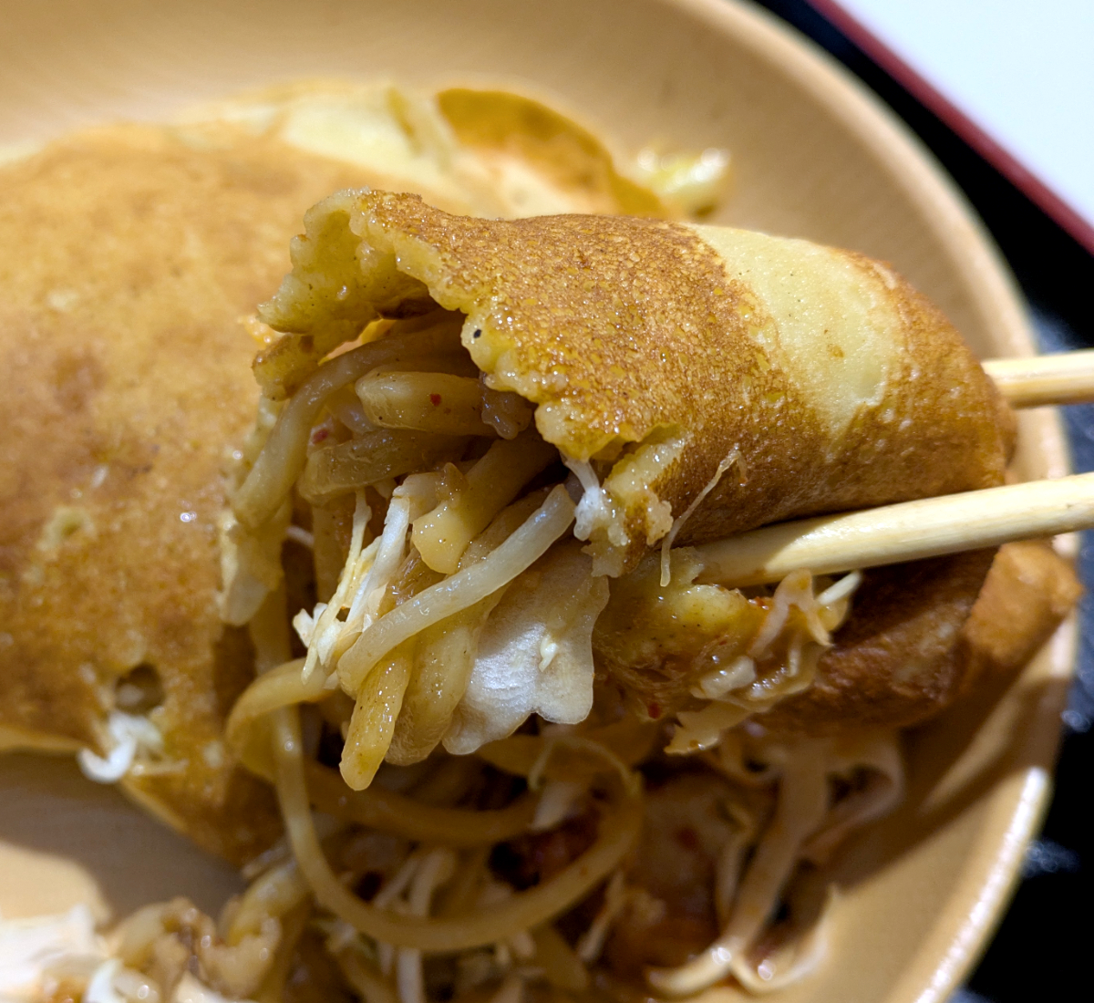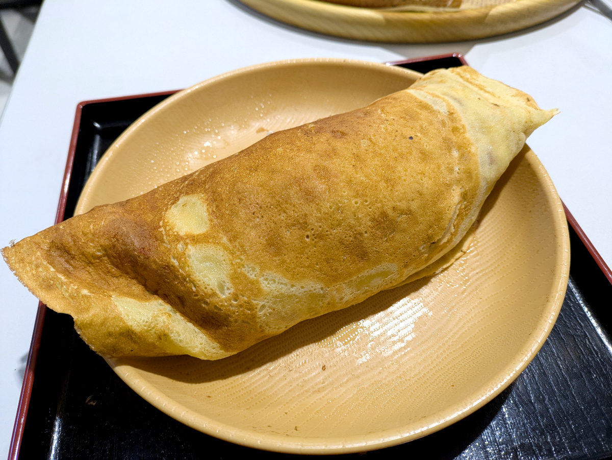 生地は割としっかりしていて、硬めのクレープっぽい。もしくはナンに近い粘りがある。これとワシワシ麺との相性は良い。ただしその分、食い応えもあって、私の箸はなかなか進まない。いくら自分を騙そうとしても、身体は正直なものだ。もはや、キャパシティの限界を越えている……。