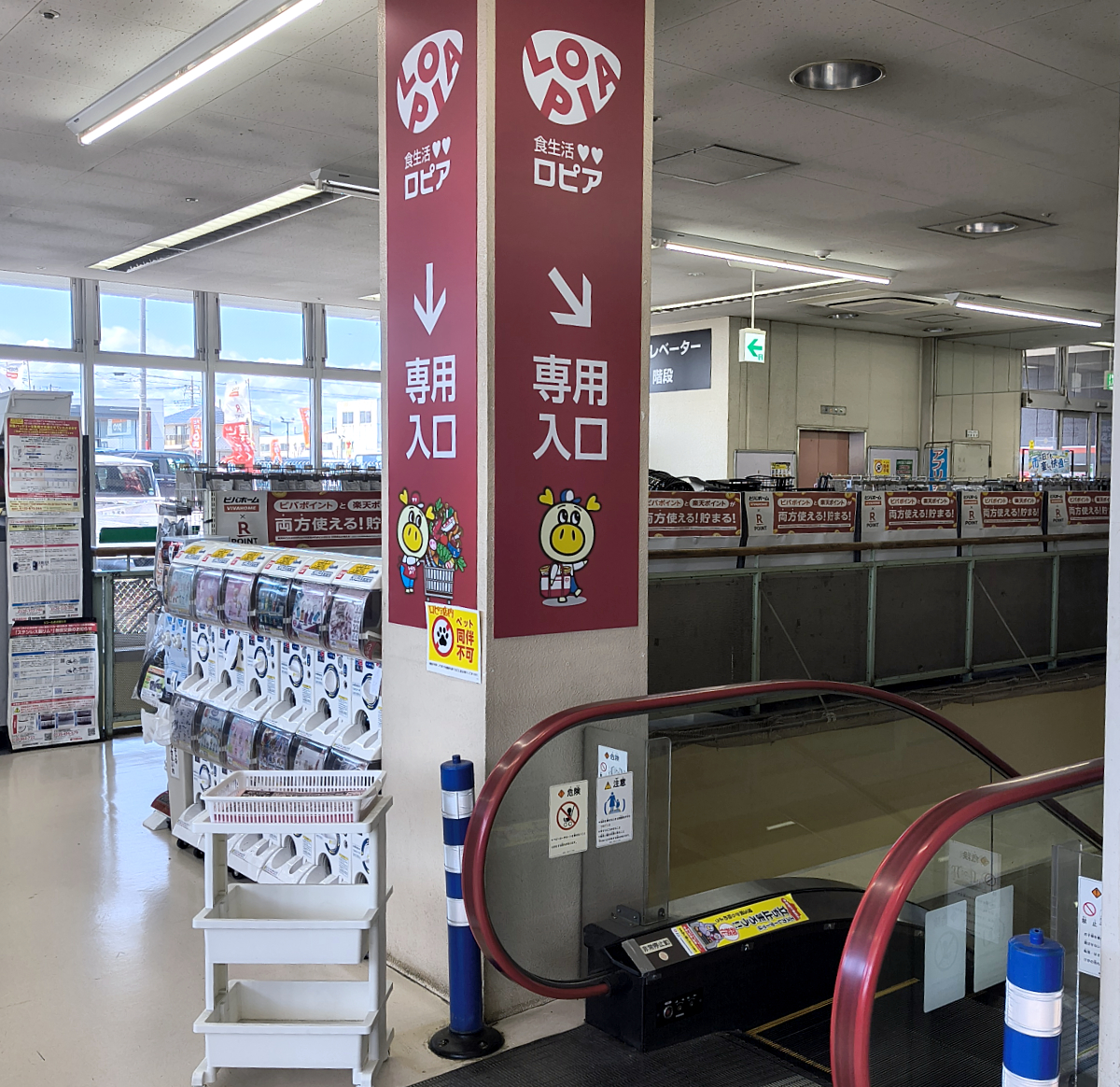 1階はビバホーム、地階はロピア。入口専用のエスカレーターで地下にGO!