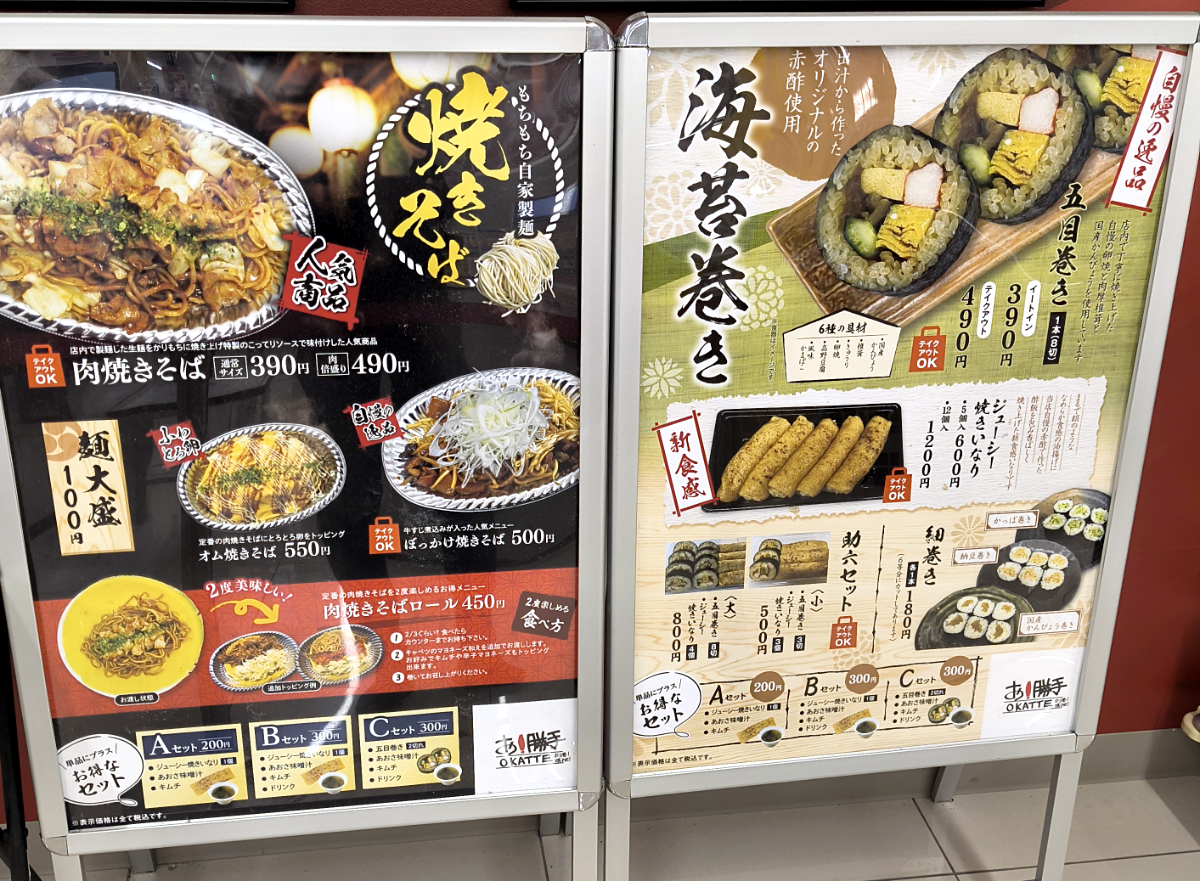 まず、お! 勝手のメニューを見ると、肉焼きそばの通常サイズが税込390円。のり巻きも1本税込390円(イートイン)。いずれもワンコインでお釣りが来る良心価格である。