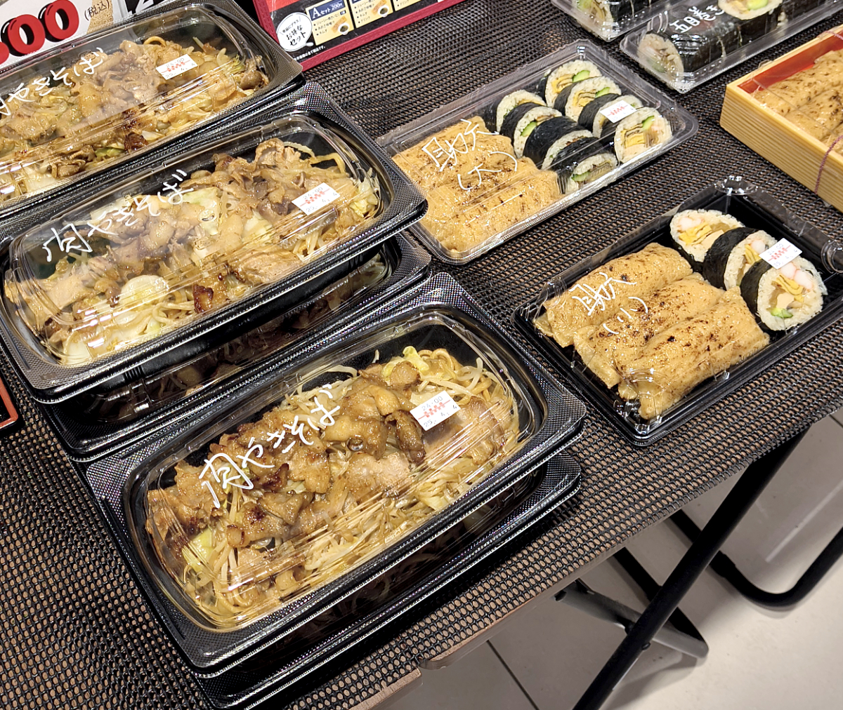 店頭に置いてある焼きそばの実物を見ると、結構量が多いんじゃない? 通常サイズだけど一般的には大盛りの量がありそうだ。隣の助六セットはのり巻き3切れ・いなり3個で税込500円だから、やっぱり安いよな。さすがロピア。
