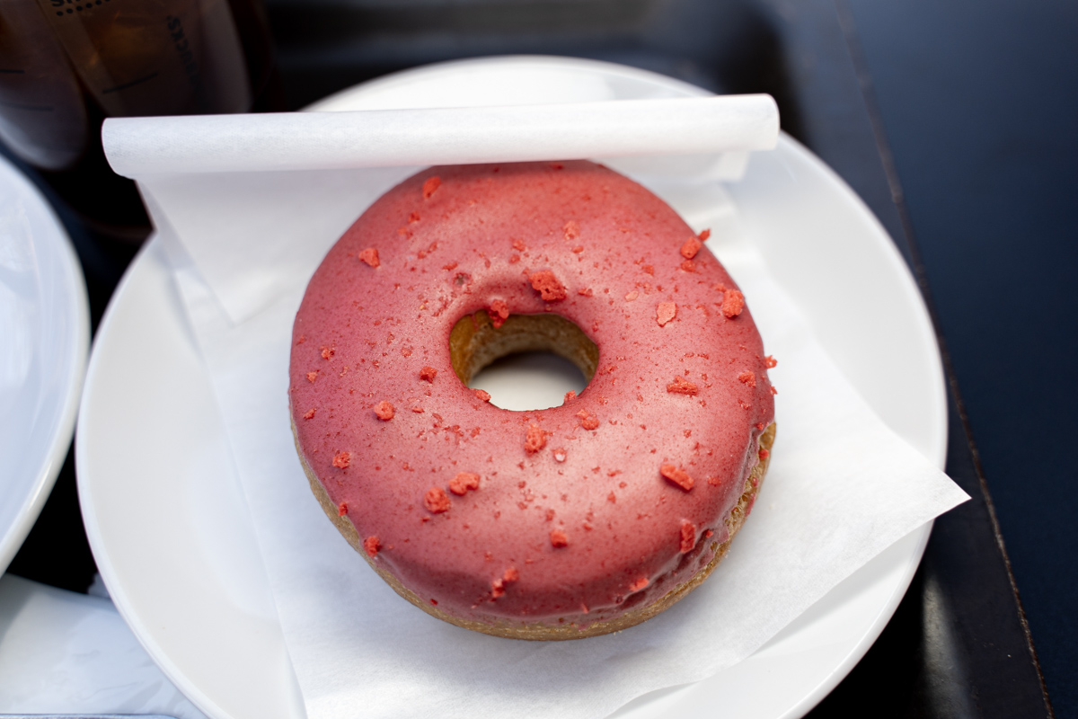 まずはドーナツからいこう。まるでアメリカのドーナツみたいな色だな。日本ではあまり見ないステイツみのあるつよつよピンクで、ビジュアル的に若干心配になる。