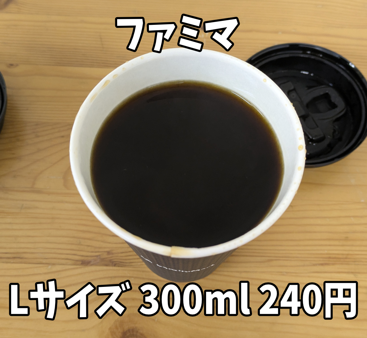 最後にファミマのコーヒー。セブン・ローソンを使う頻度が高いので、自ずからファミマのコーヒーを飲む機会は少ない。Lサイズ(300ml)税込240円で、ローソンと同じ量・価格。高さのあるカップなのでローソンより量が多い気がするけど同じだ。