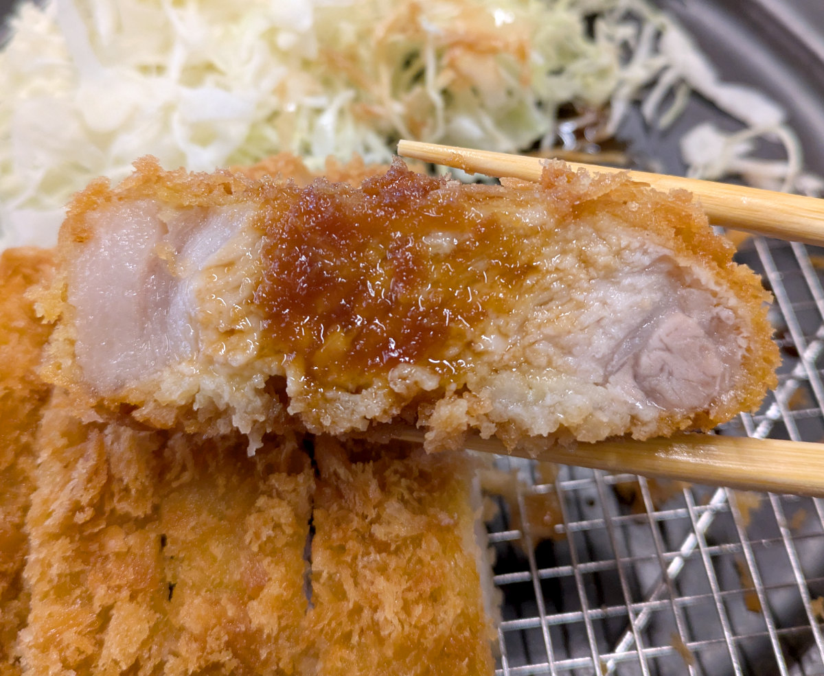 断面を見ると、衣はかなり薄い。肉の食感を強調したい意図がうかがえる。で、実際に食べてみると、庄内豚の持つ脂の上品な甘さが際立つ。これはソースだと肉の味の邪魔になりそうなので、塩で食べるのが1番良さそうだ。