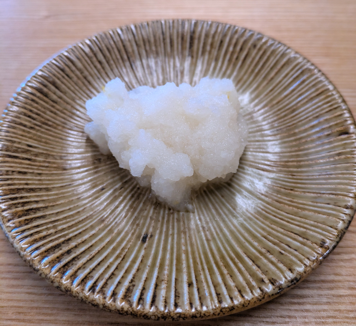 頼んだのは、下から2番目に安い「上ロースカツ定食」(税込2750円)である。注文したら、まずは大根おろしが出てきた。これはおかわり自由。とんかつは揚げ立てを提供するために10分程度かかるので、その間の先付けというわけだ。