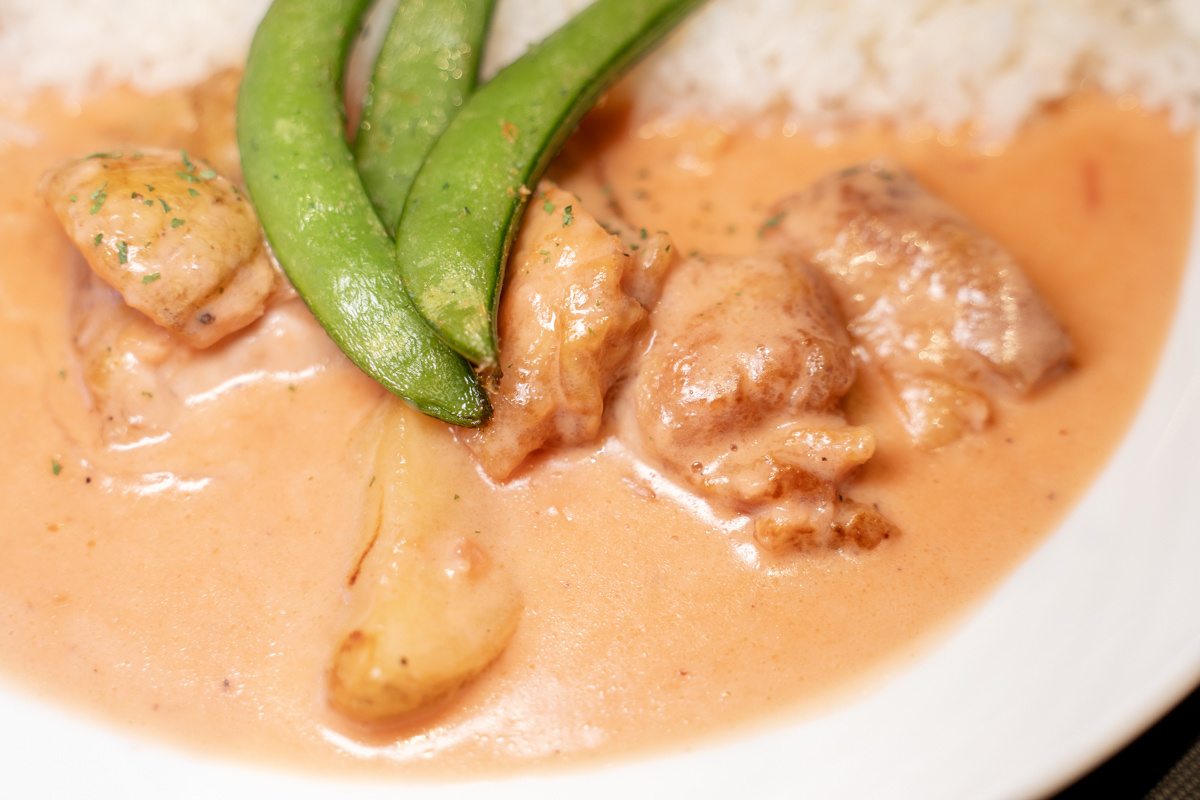 これはぶっちゃけ、ロースかつの方が、かつらしさを味わえたかもしれない。見ての通り完全にシチューをまとい、その水分が “かつ” らしさにとって重要な要素である、衣のサクサク感みたいなものを減退させている。