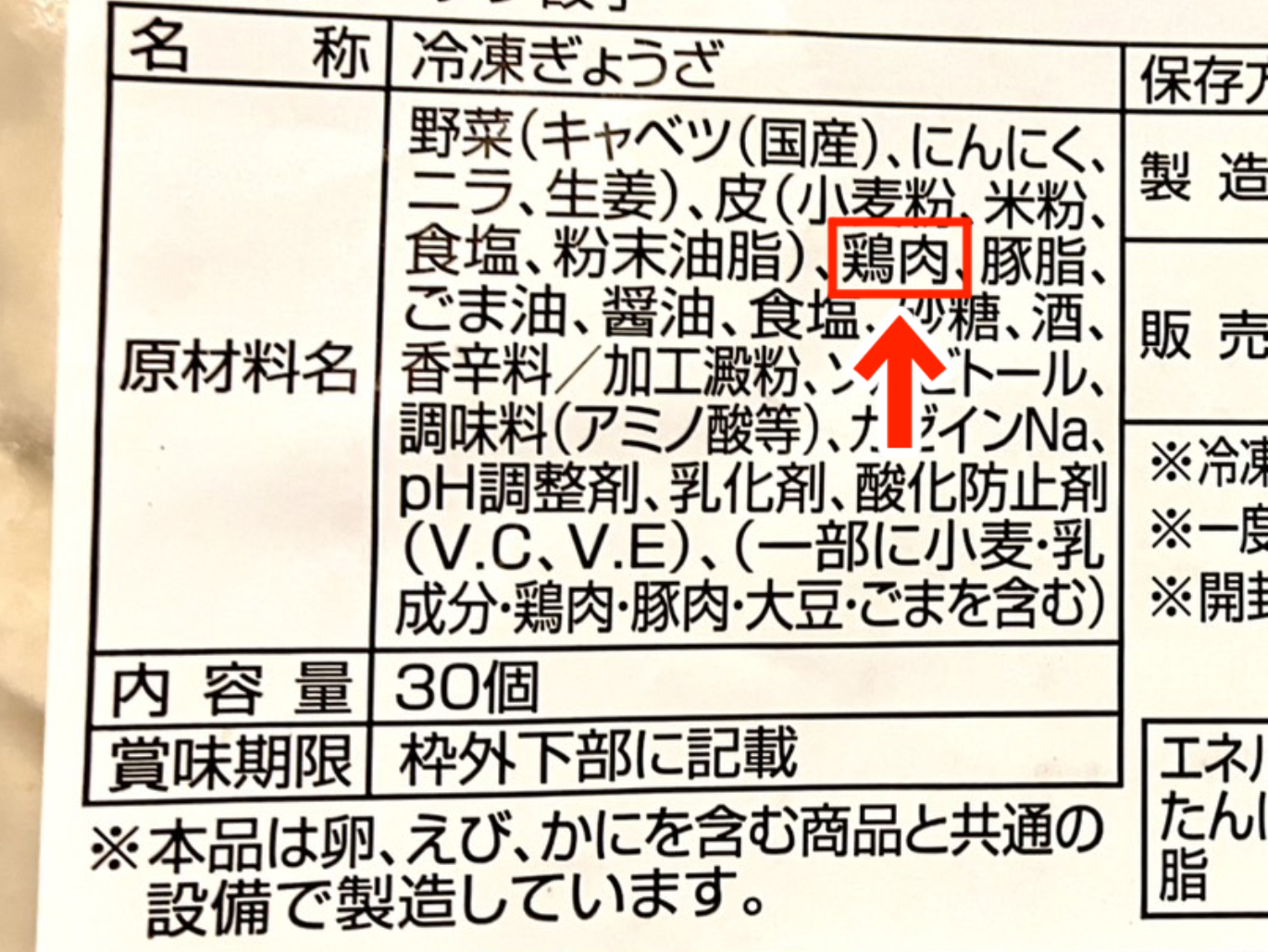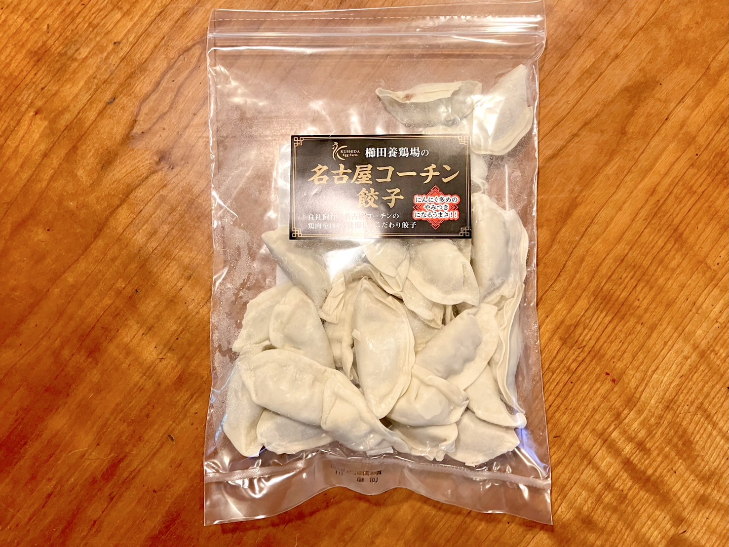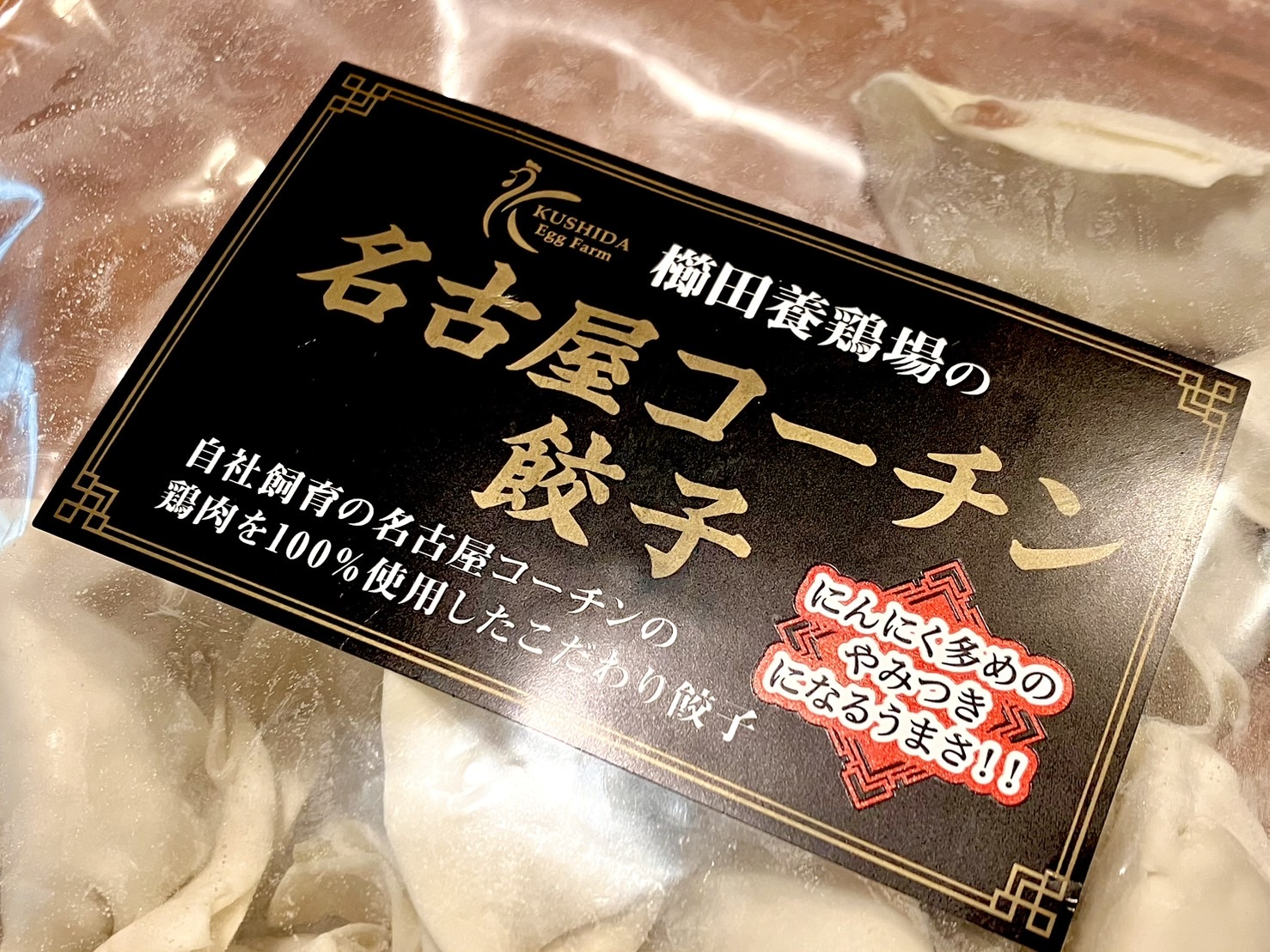こちらの餃子、なんと肉だねに名古屋コーチンが使われているそうだ。確かに原材料名にもバッチリ「鶏肉」って書いてある。