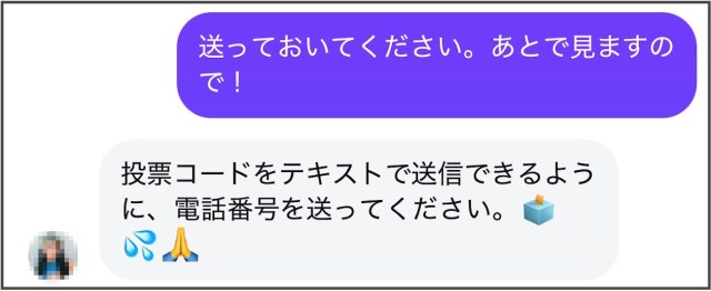 「投票コードをテキストで送信できるように、電話番号を送ってください」と彼女。