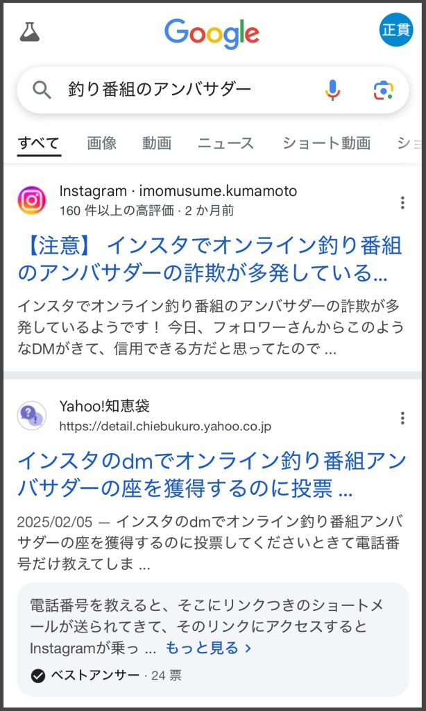 情報を整理すると、FacebookやInstagramなどの各種SNSで「釣り番組のアンバサダーオーディション」への投票を呼びかけ、電話番号を要求するDMの報告が相次いでいるという。