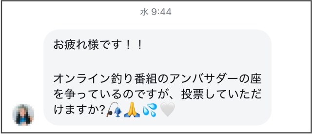 なんかこの流れ、怪しい気がする。てか、今さらだけど「釣り番組のアンバサダー」って何だよ。一応「URLを送ってくれたら投票します」と返事をしたのだが、その後、彼女から投票先のリンクが送られてくることはなかった。