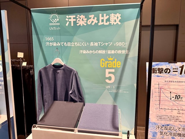 とにかくグレーといえば、汗が最も目立ちやすいカラー。ツルッとした生地だが、速乾性が高く汗で濡れても乾きやすいため汗ジミが目立たないという。またUVカット、シワ・型崩れ防止……と、やはりワークマンらしく機能満載な様子。