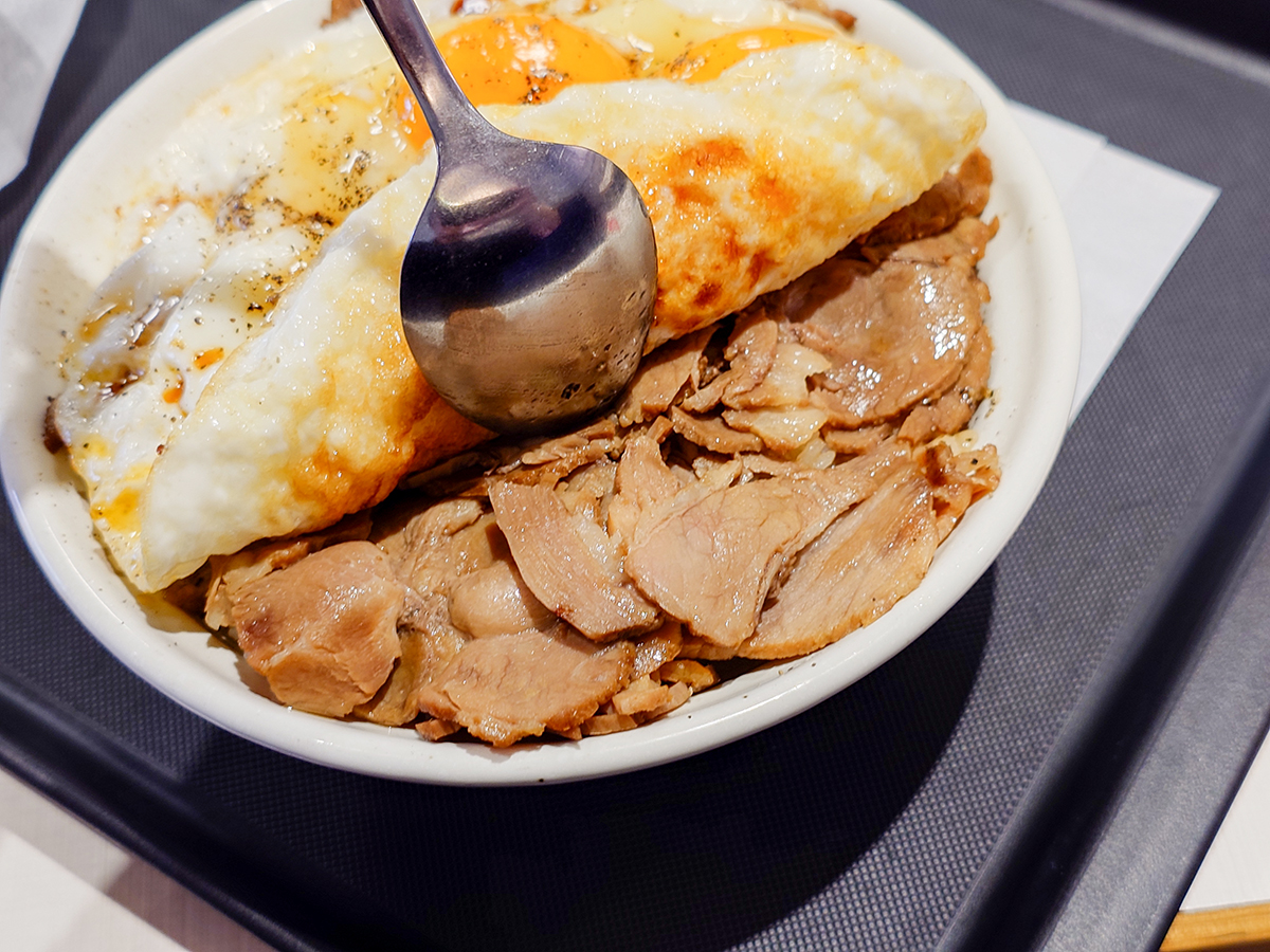 そしてウマさに関しては、議論の余地すら無いものだ! 黄身が生な目玉焼き、凄まじい量のチャーシュー、そしてご飯だぞ。化学的にも絶対美味くなる組み合わせだろう!