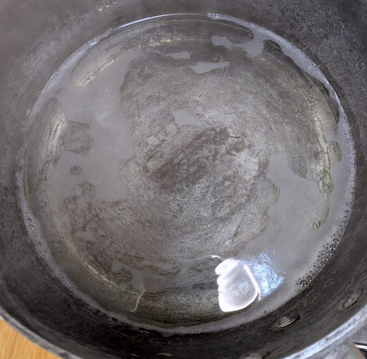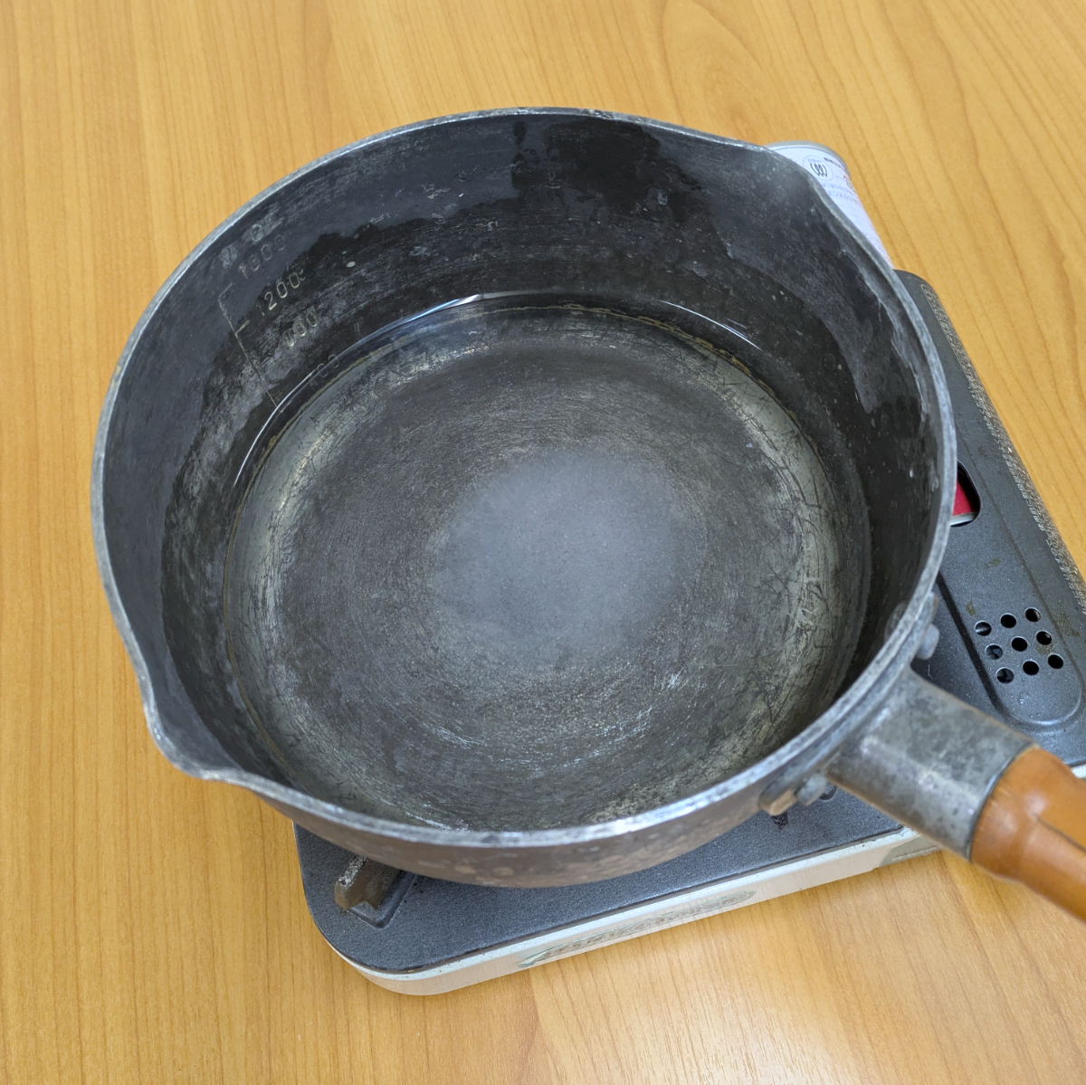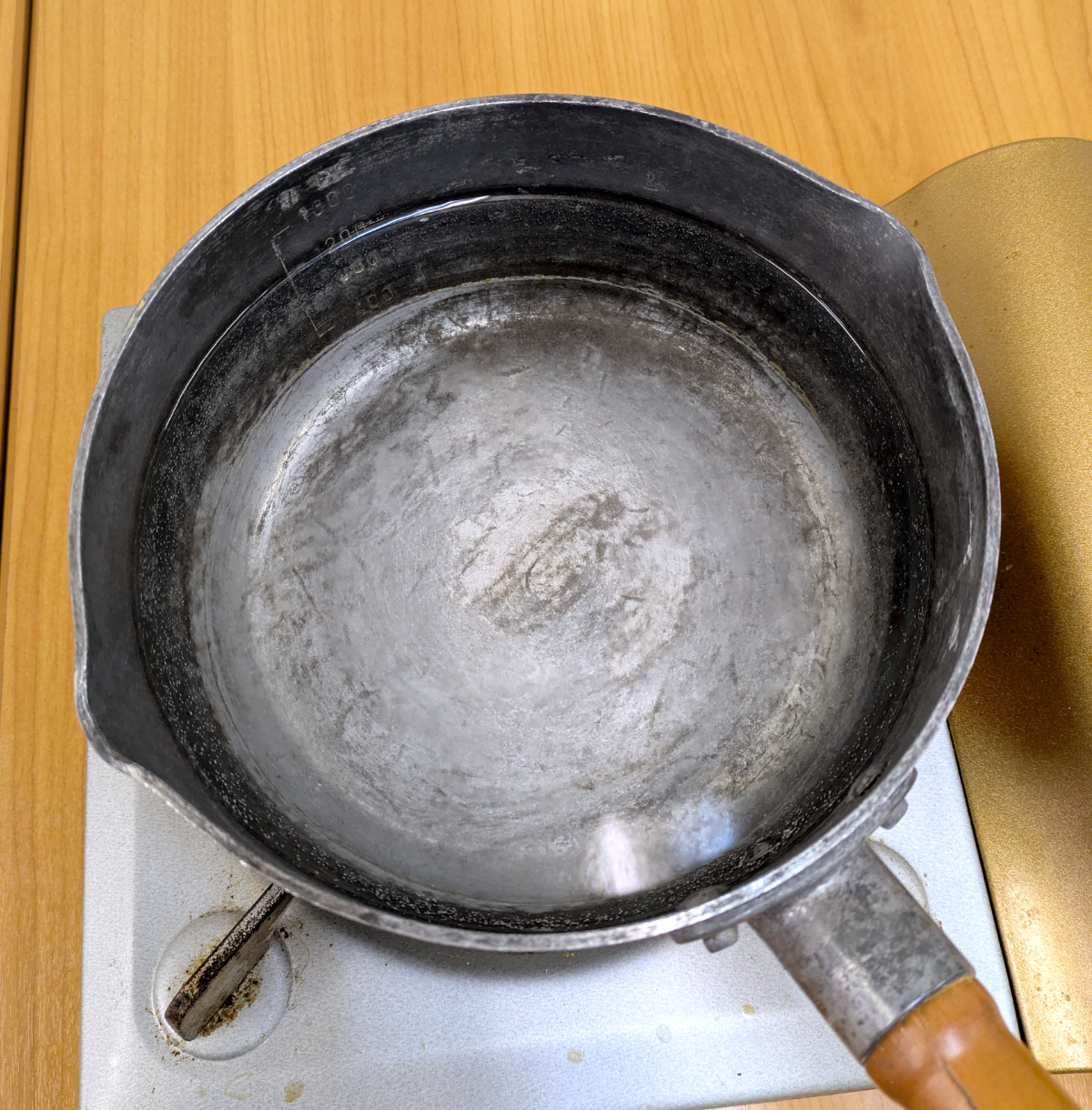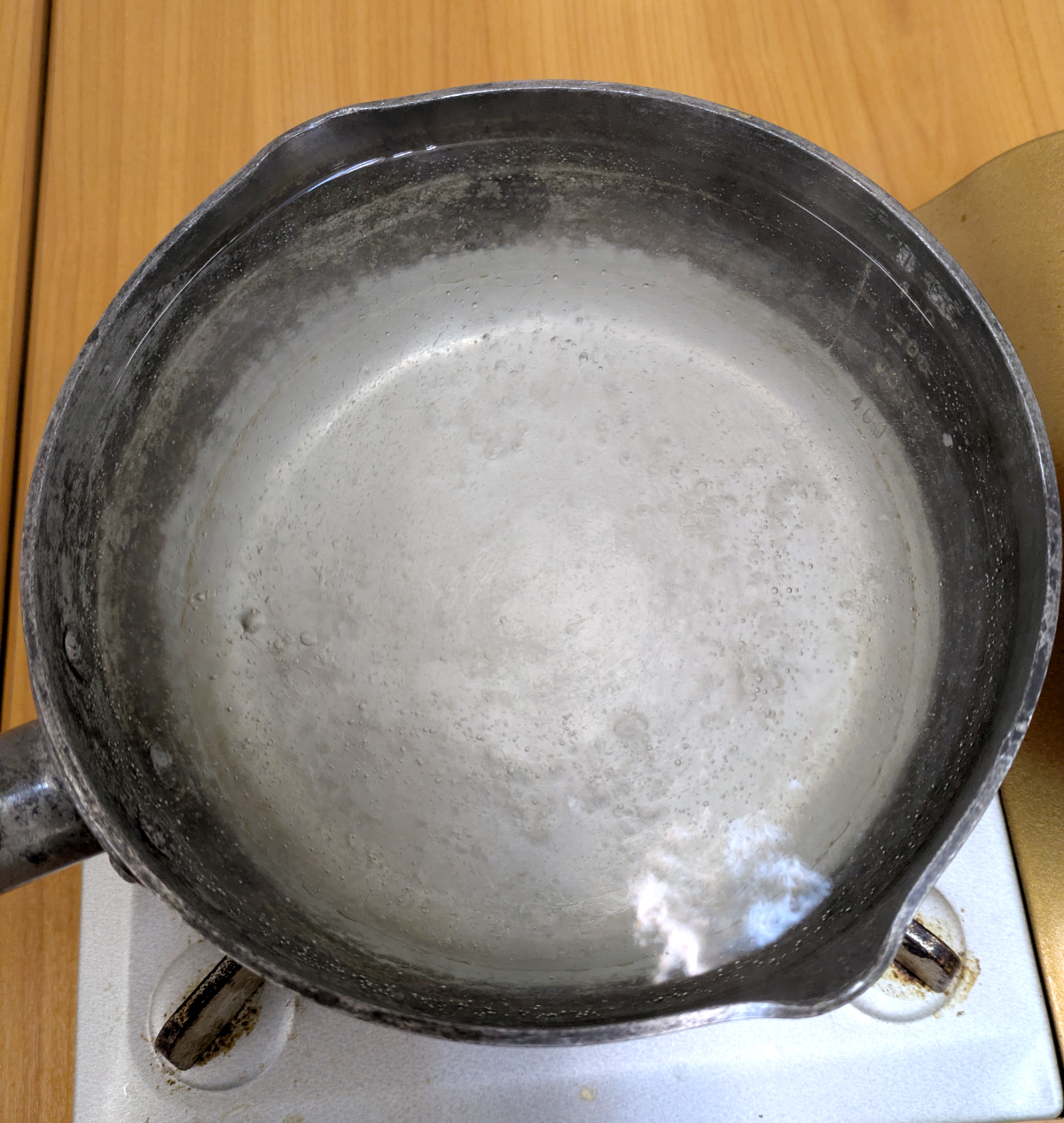 鍋に水を400ml入れて、その40分の1にあたる10グラムのクエン酸を投入。そのままコンロに乗せて、あとは沸かすだけ。本当にこれで黒ずみはとれるのだろうか?