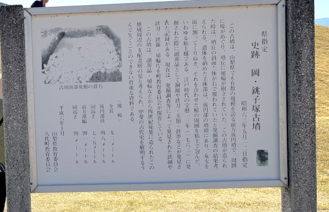 山梨県の広報サイトによると、これは山梨県屈指の古墳で、その大きさや見晴らしのよい場所などから察するに、このあたりの首長を祀ったものだと考えられているとか。