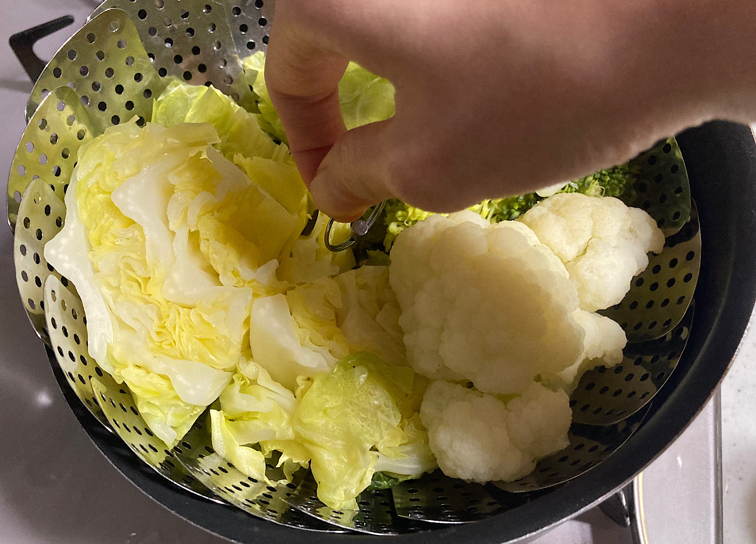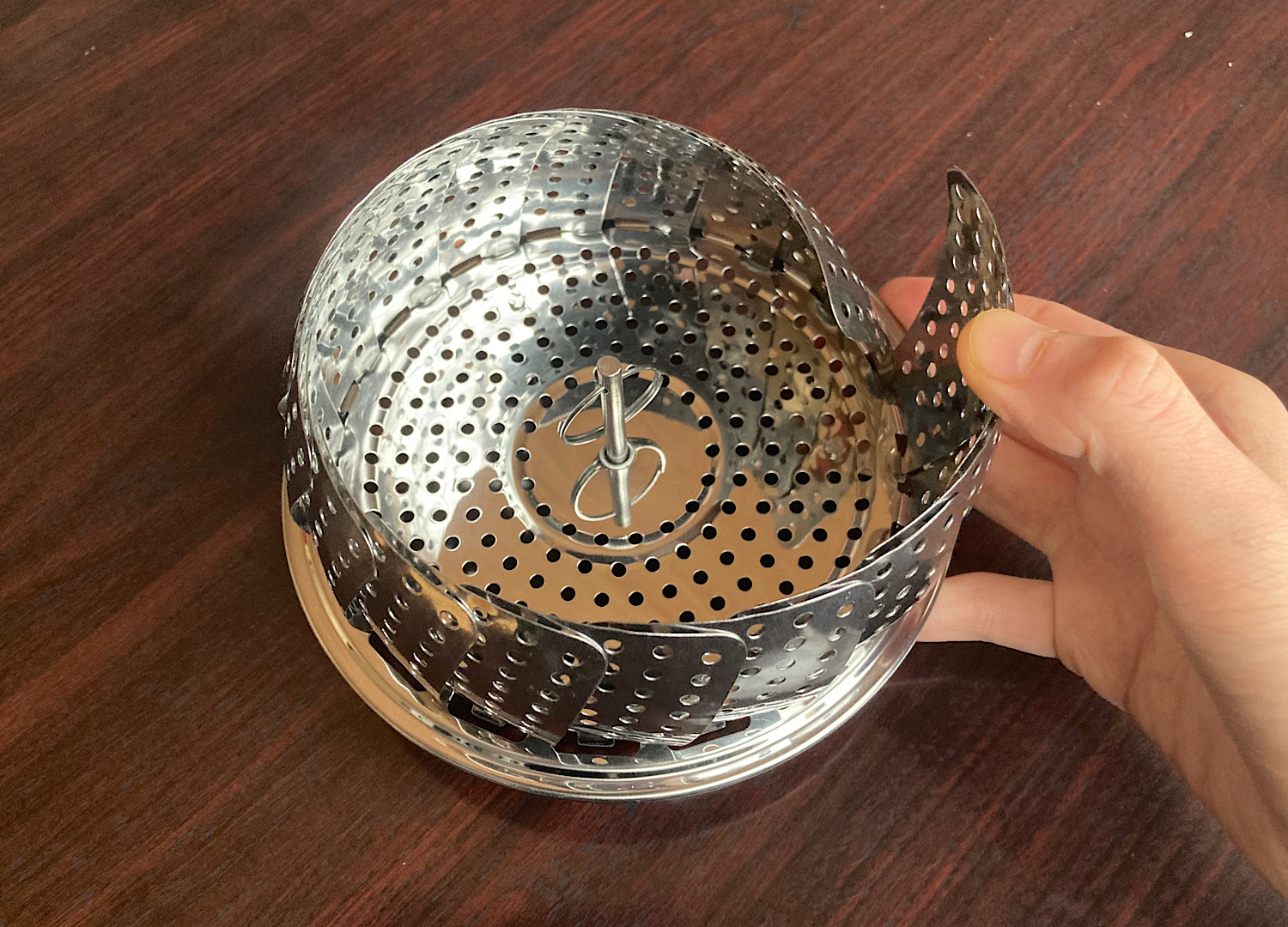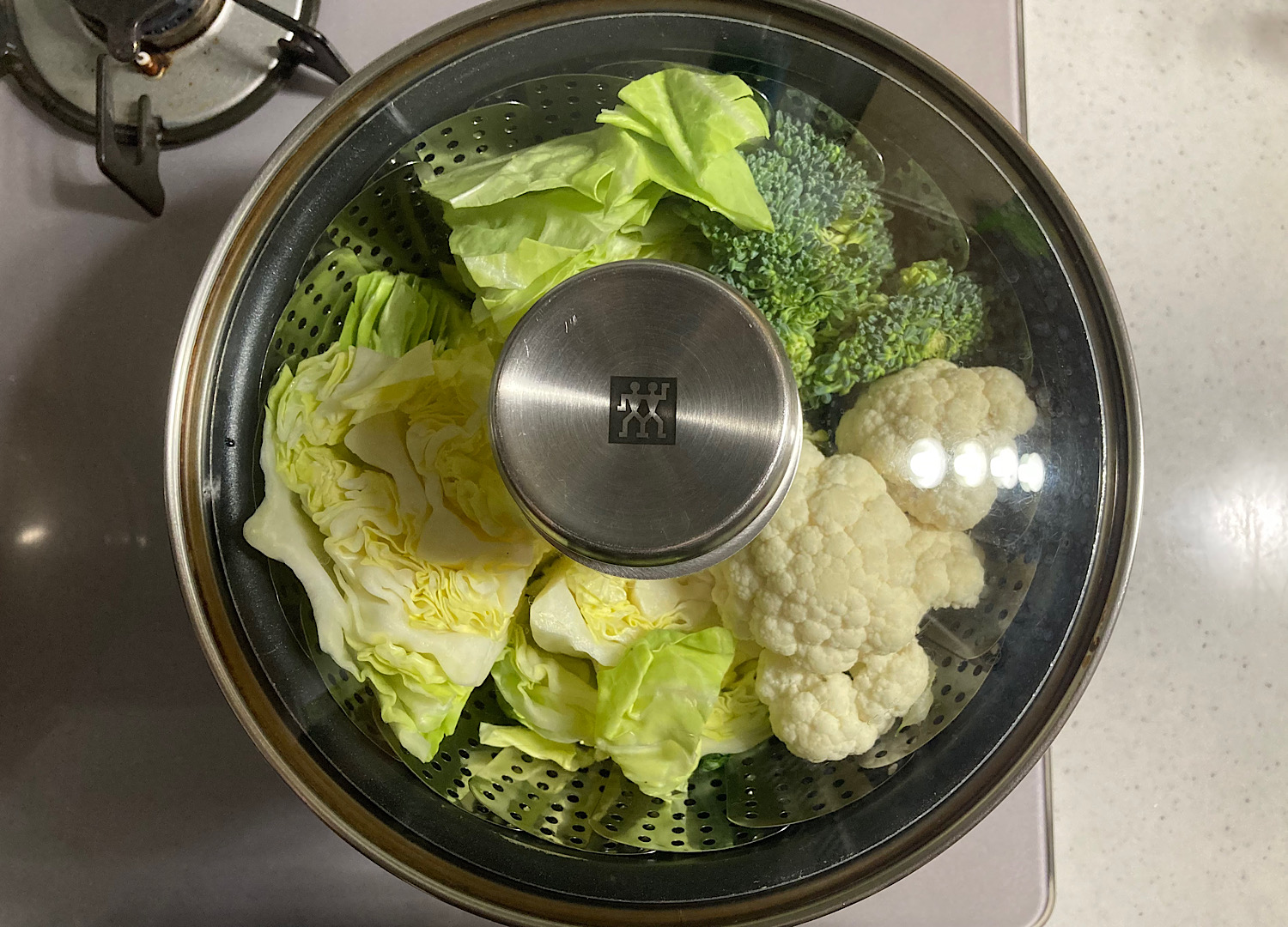鍋の大きさピッタリに広がっているので、蒸し器を取り出す時だけちょっと難関ポイントだった。安定性もなさそうなので、これをそのまま出して食器にするのは無理そう。