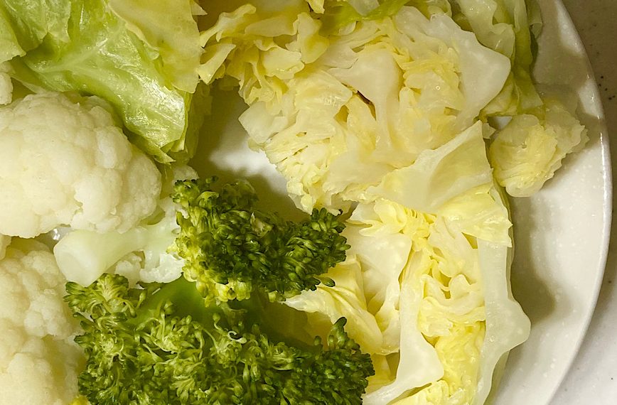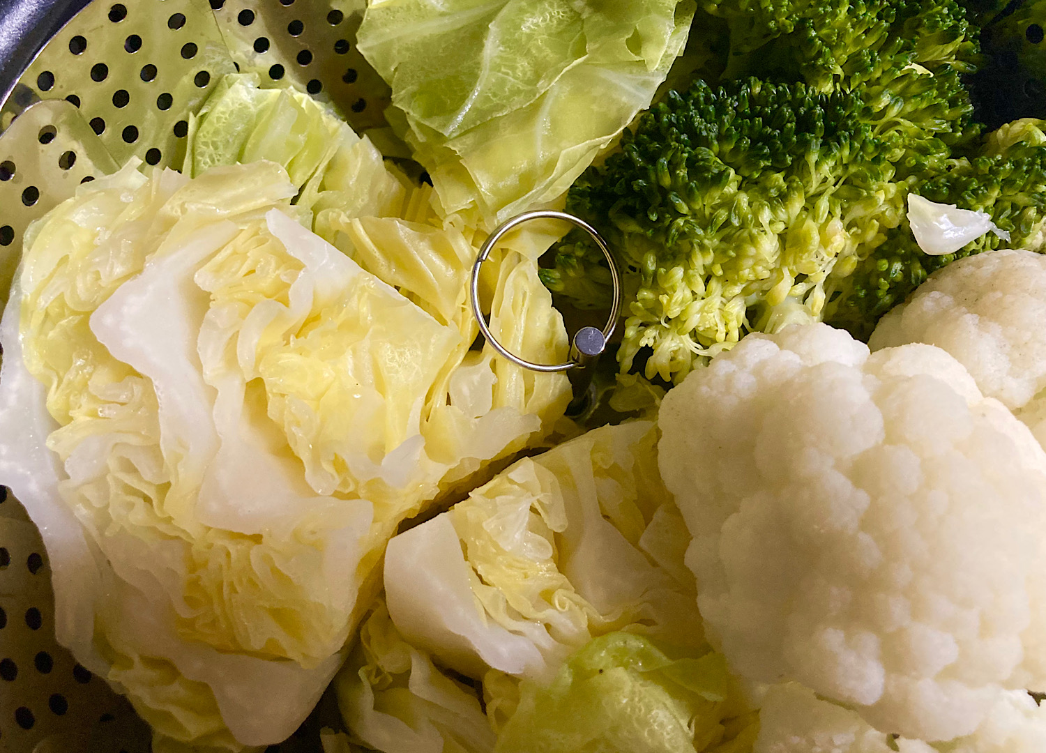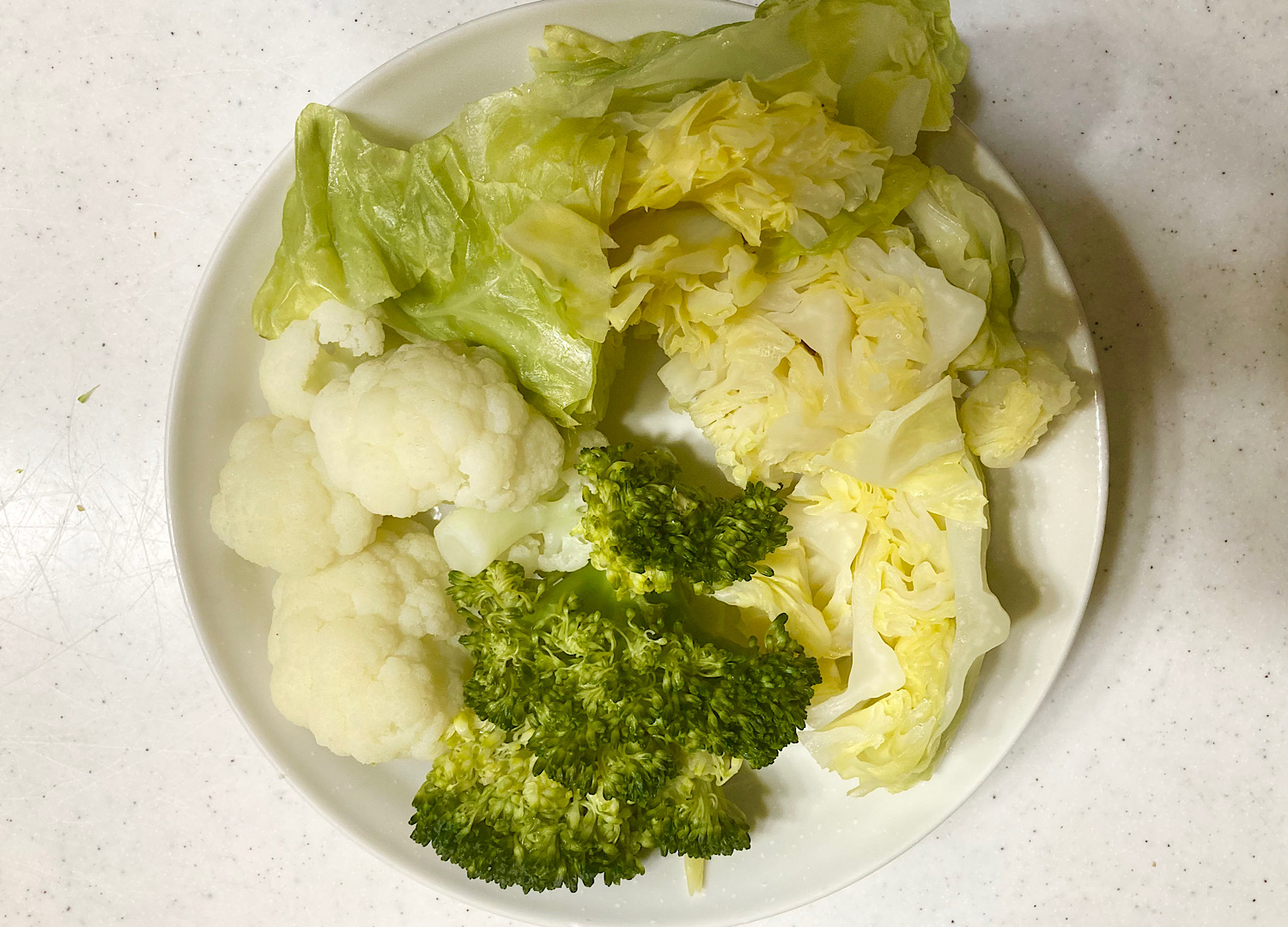 食材を置く。今回は春キャベツ、ブロッコリー、カリフラワーを用意。