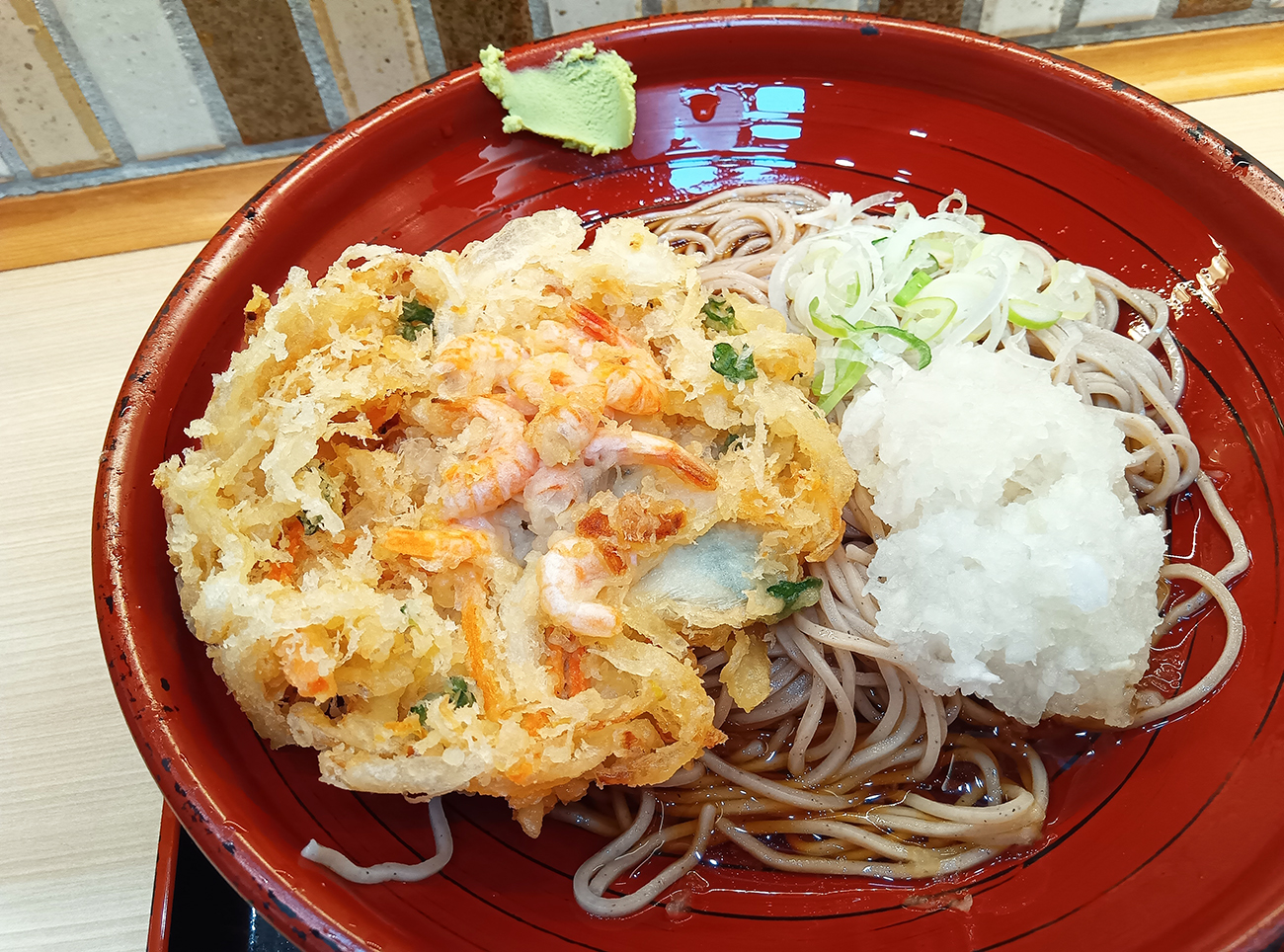 当初、普通に朝ご飯を食べようと寄った私(中澤)。注文したのは冷やしの「小海老入りかき揚げ天(税込710円)」だ。箱根そばのつゆは甘さ控えめで出汁寄りの味なので、個人的には冷やしの方がウマイと思う。さらに、冷やしには大根おろしが入っているんだけど、この大根おろしが鬼おろしなところが良い。粗くてザクザクめなのである。