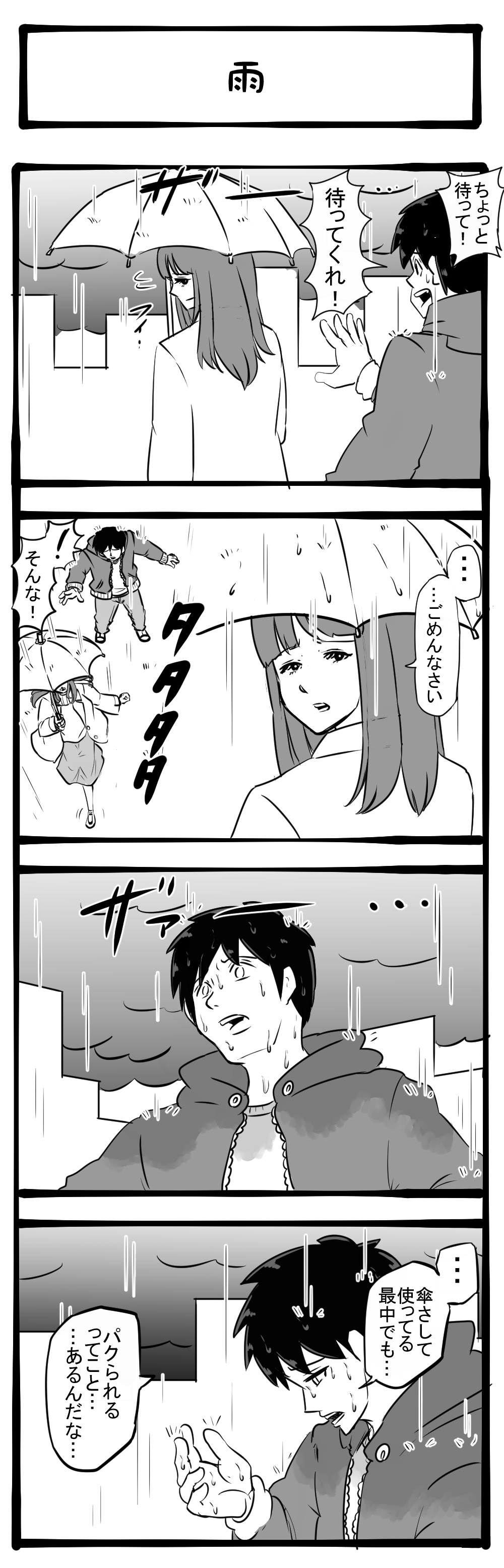大胆に逃走! 走り去る女と取り残された男! 四コマサボタージュBYD第85回「雨」