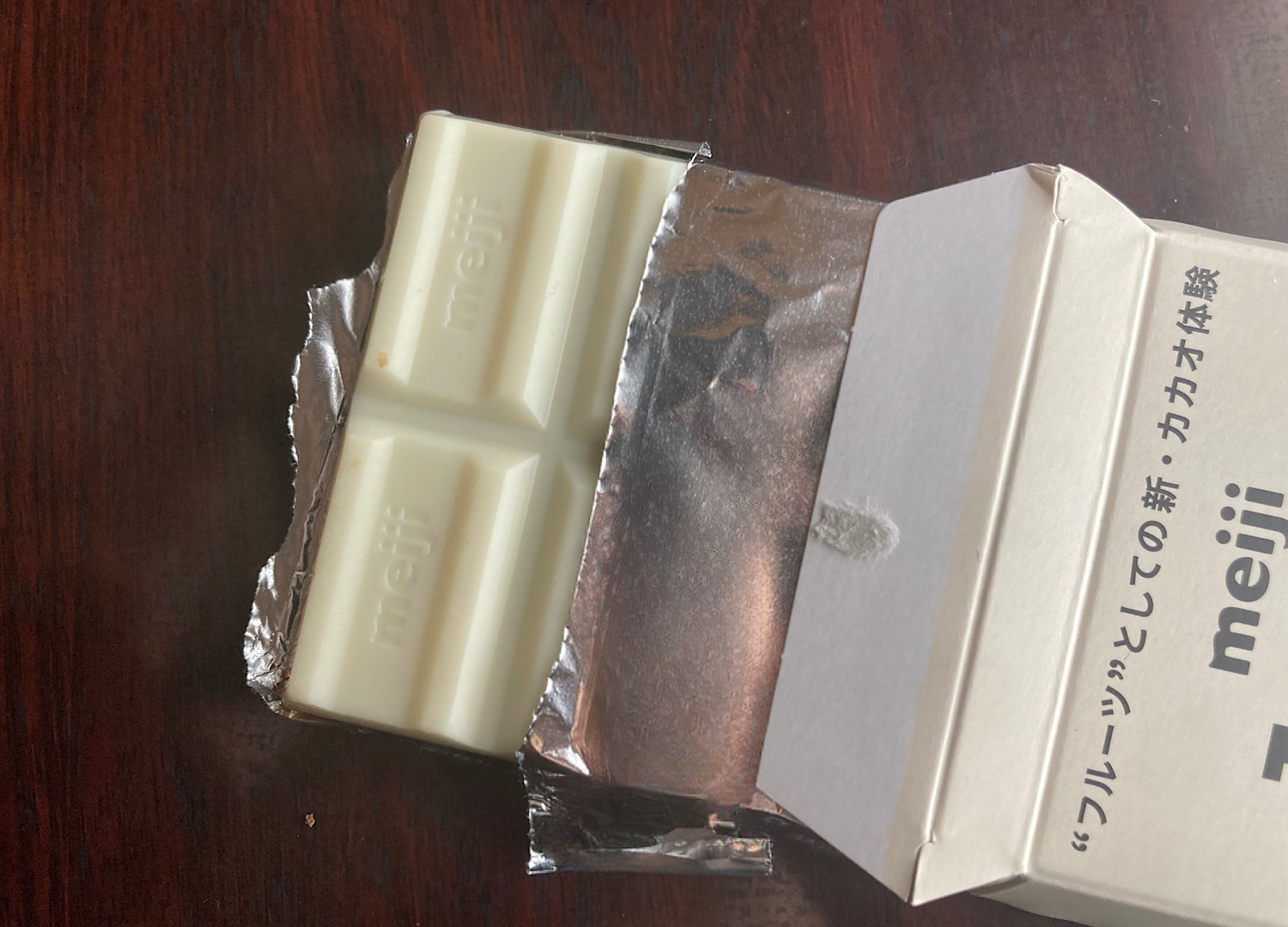 とはいえ不快な酸味ではない。下半分の茶色い部分はおそらく普通のチョコなのだが、白い部分にすっきりとした酸味とザラっとした舌触りを感じる。