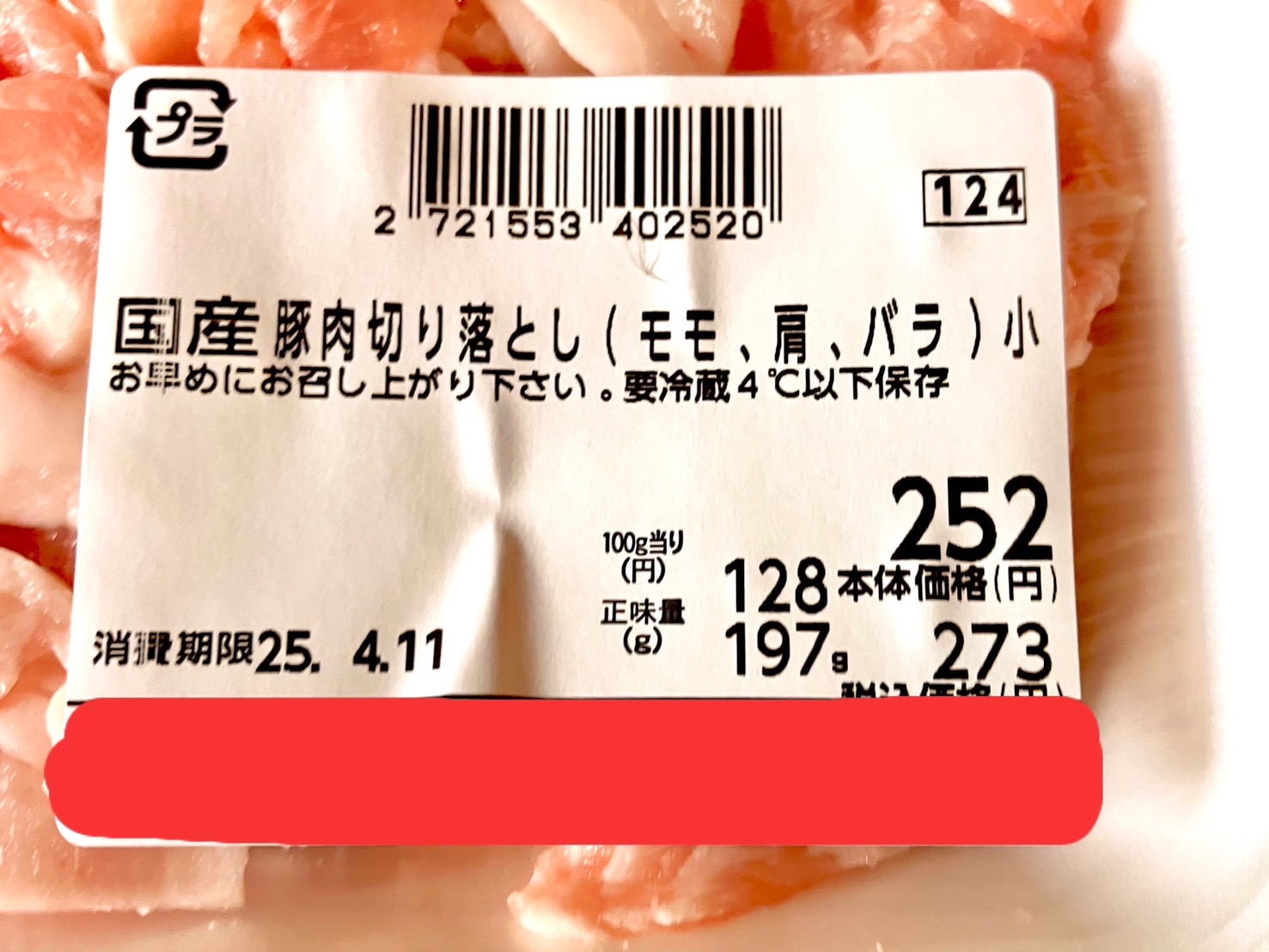 比較のためにスーパーで買った豚肉の切り落としの値段をチェックしてみると、197gで273円だった。つまり1gあたりの値段は約1.4円。
