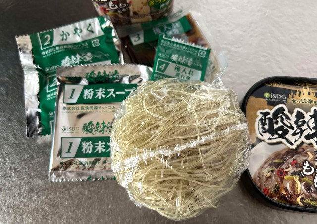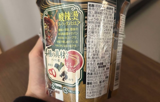 オマケのようにして付いてきた「酸辣湯」も食べておこう。こちらもご存知、酸味と辛味の効いた食べ物だ。麻辣湯同様、モチモチ春雨にかやく(干しエビにチンゲン菜、唐辛子、海苔)粉末スープと液体スープ、そして調味酢と調合油が入っている。