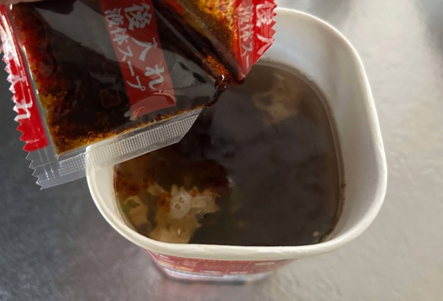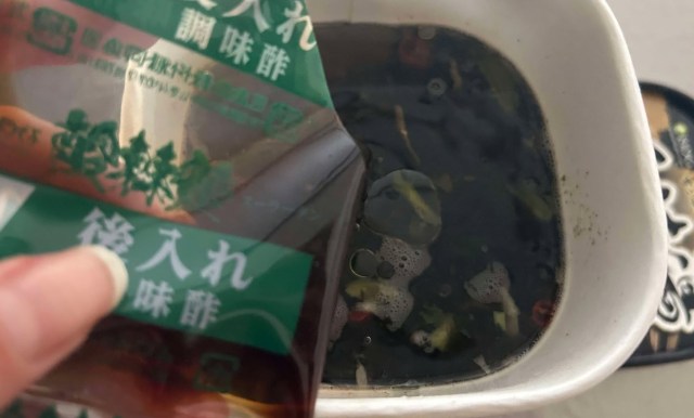 先ほどと同じようにしてお湯を入れて、後入れの酢と油を加えてチャチャっと完成。やはり麺が美味しく、そして酢がしっかり効いていて、これまた記者は好みだ。何ならもう少し酢が入っていても良い。
