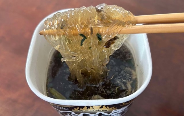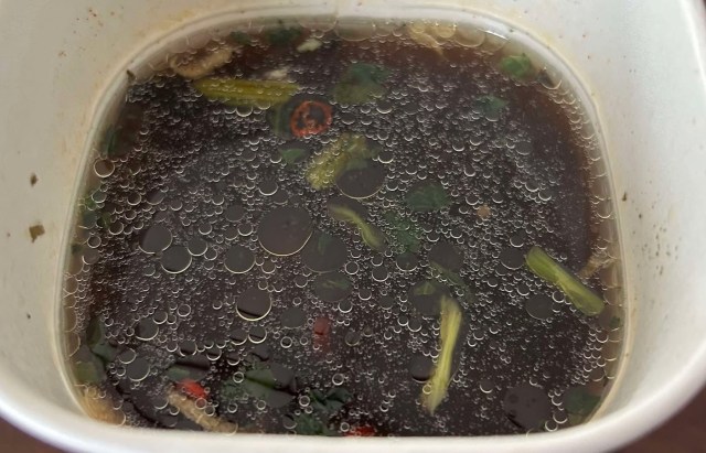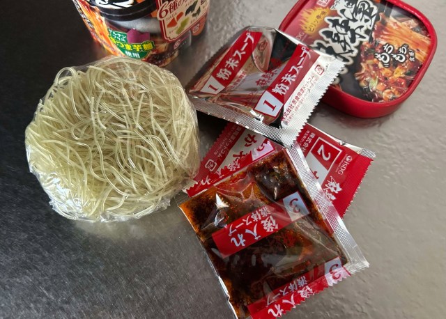 カップに春雨を入れ、これらのかやくと粉末スープを入れてお湯を注ぎ2分。かき混ぜた後、液体スープを入れればあっという間に食べられるところがありがたい。