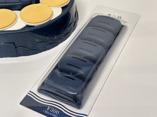 そんなスリコで現在展開中なのが「おうちでお寿司パーティー」だ! 寿司オケや寿司ゲタ(足の付いた木製の皿)のような雰囲気アイテムのほか、スリコらしい実用アイテムもいっぱい。「押し寿司型」は正方形・長方形の2種類あるし、誰でも簡単に巻き寿司ができる「巻き寿司型」も2種類。まるで寿司屋のような湯飲みや醤油さしも並ぶ。