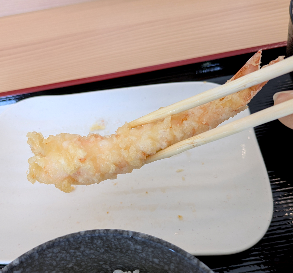 食べてみると、たしかに衣のつき具合やサックリとした揚げ具合は、技術の高さを感じさせる。てんやよりも上のクオリティといっても差し支えないかも。