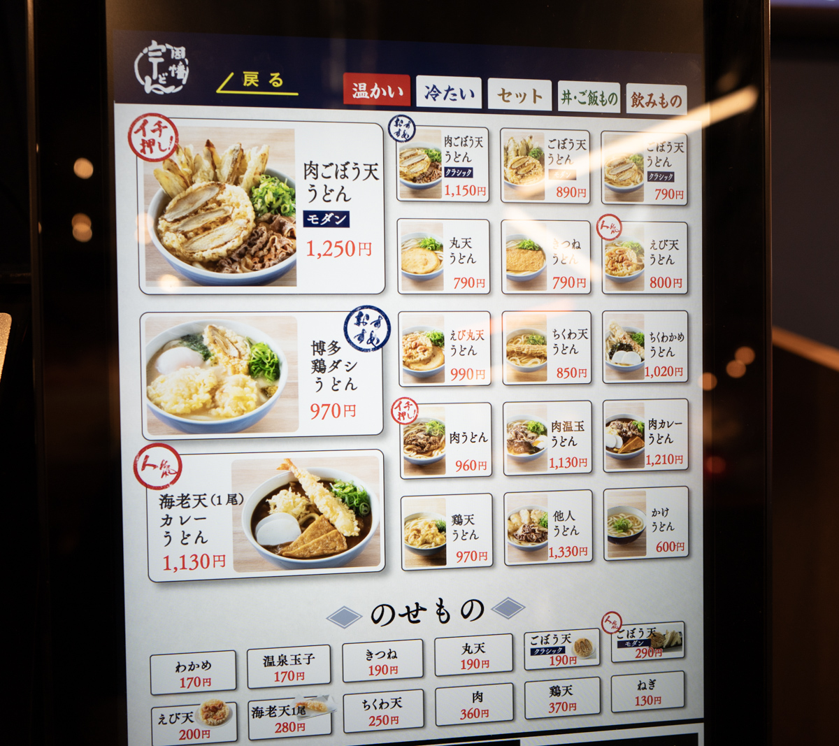 色々あるが、やはり初手なので、変化球ではなく最もベーシックなものを選びたいところ。ここはやはり、温かい「肉ごぼう天うどん」だろうか。その他のメニューや価格は記事の最後に写真を掲載しておく。