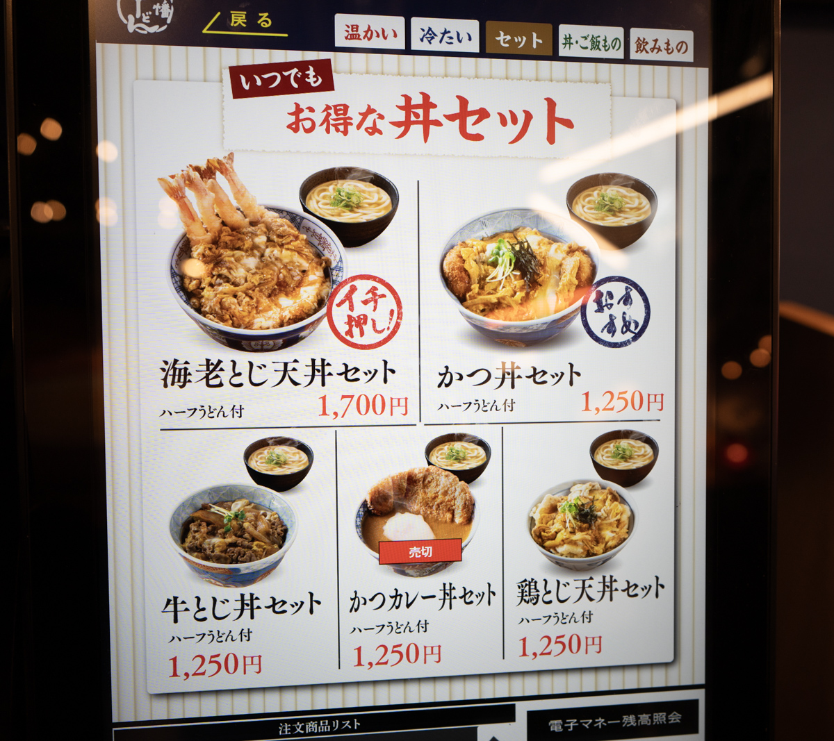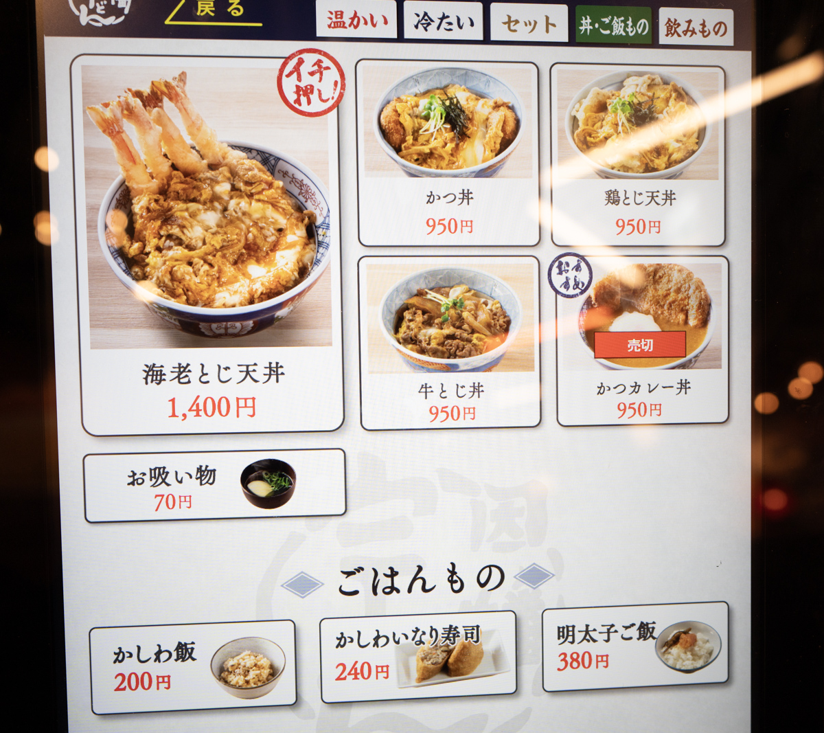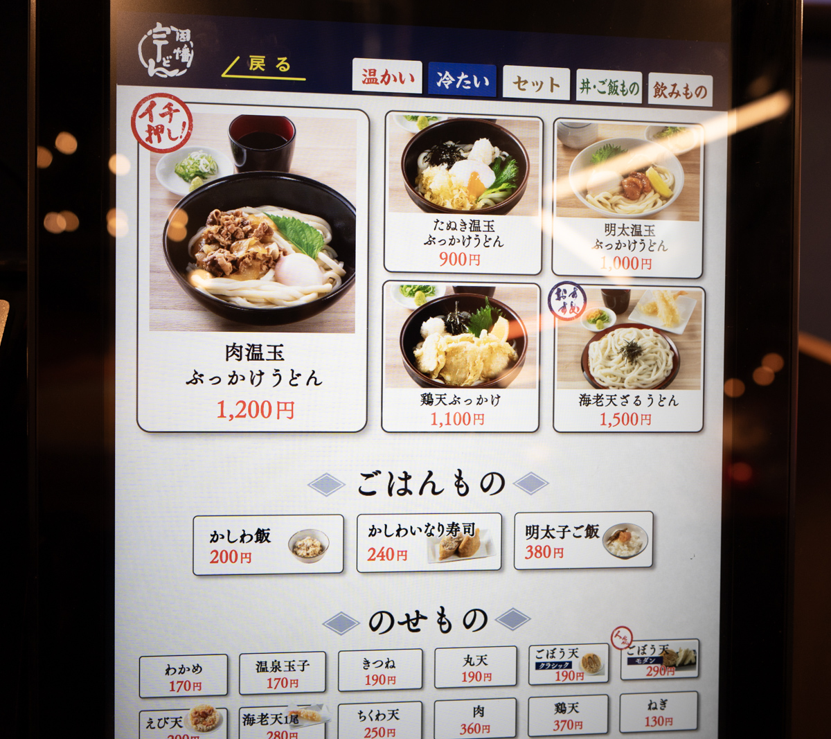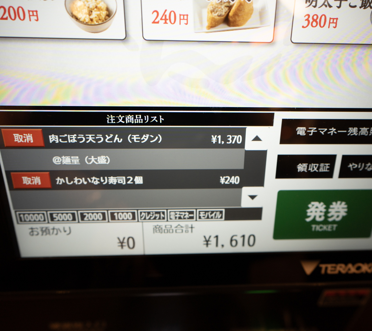 モダンとクラシックがあるが、モダンが一番ビッグに表示されているのでこちらにしておこう。麺は大盛りだ。あとは……「かしわいなり寿司」も試してみよう。合計で1610円。