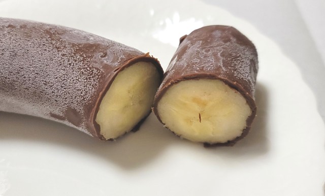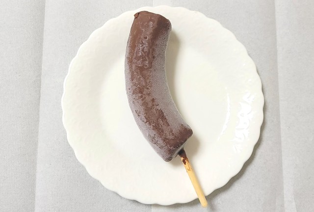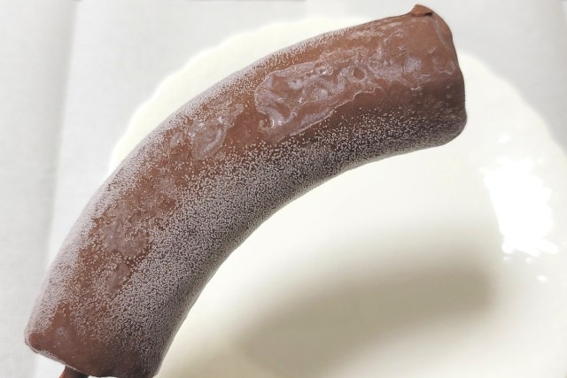 ともあれ、パッケージを剥いて実物と相対してみると、冷凍とはいえ大いにノスタルジーをかき立ててくれる見た目がそこにはあった。バナナの果肉をチョコで覆い、フランクフルト状に仕立てたこの伝統的な「形式」こそが、まさに本商品の最大の特徴だと言える。