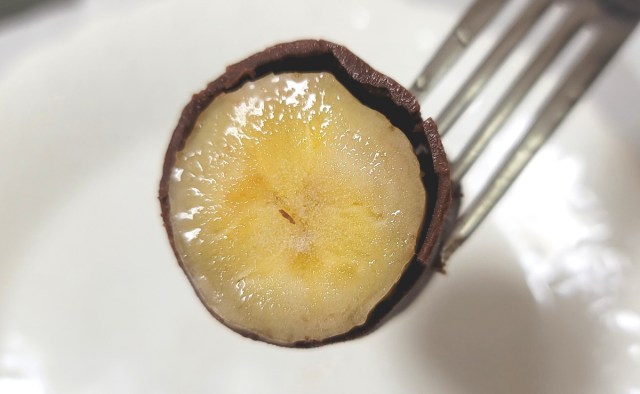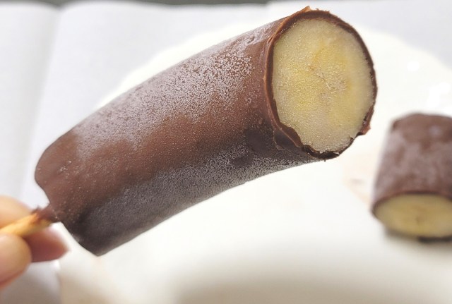 やや硬そうに見えたので、冷凍庫から取り出して20分ほど置いたのち実食したのだが、それが功を奏したようだ。小気味良い歯触りのチョココーティング、そして何よりそのチョコと調和する柔らかなバナナの食感が、この上なく胸をときめかせた。