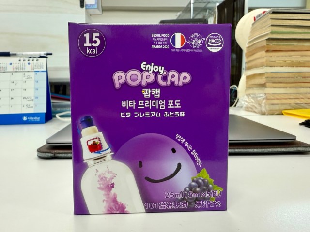 韓国の若者の間で売れまくっている新感覚ドリンク・ポップキャップ。ペットボトルコーナーではなく、インスタントコーヒーやドリップバッグなどが並ぶコーナーで発見。箱で売っているから初めてだとちょっと見つけにくいかもしれない。